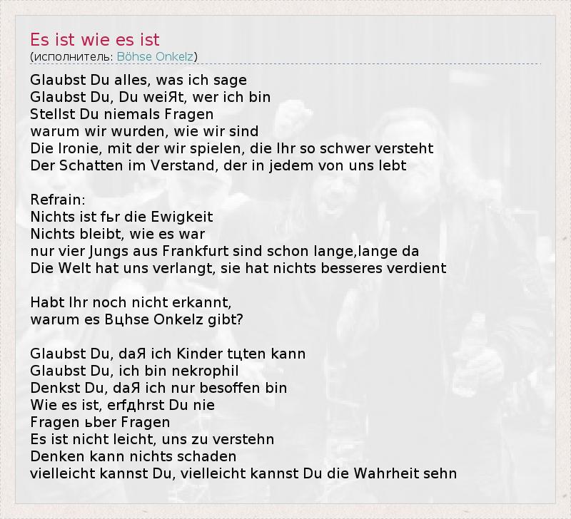 Glaubst Du alles, was ich sage Glaubst Du, Du weiЯt, wer ich bin Stellst Du niemals Fragen warum wir wurden, wie wir sind Die Ironie, mit der wir spielen, die Ihr so schwer versteht Der Schatten im Verstand, der in jedem von uns lebt Refrain: Nichts ist fьr die Ewigkeit Nichts bleibt, wie es war nur vier Jungs aus Frankfurt sind schon lange,lange da Die Welt hat uns verlangt, sie hat nichts besseres verdient Habt Ihr noch nicht erkannt, warum es Bцhse Onkelz gibt? Glaubst Du, daЯ ich Kinder tцten kann Glaubst Du, ich bin nekrophil Denkst Du, daЯ ich nur besoffen bin Wie es ist, erfдhrst Du nie Fragen ьber Fragen Es ist nicht leicht, uns zu verstehn Denken kann nichts schaden vielleicht kannst Du, vielleicht kannst Du die Wahrheit sehn