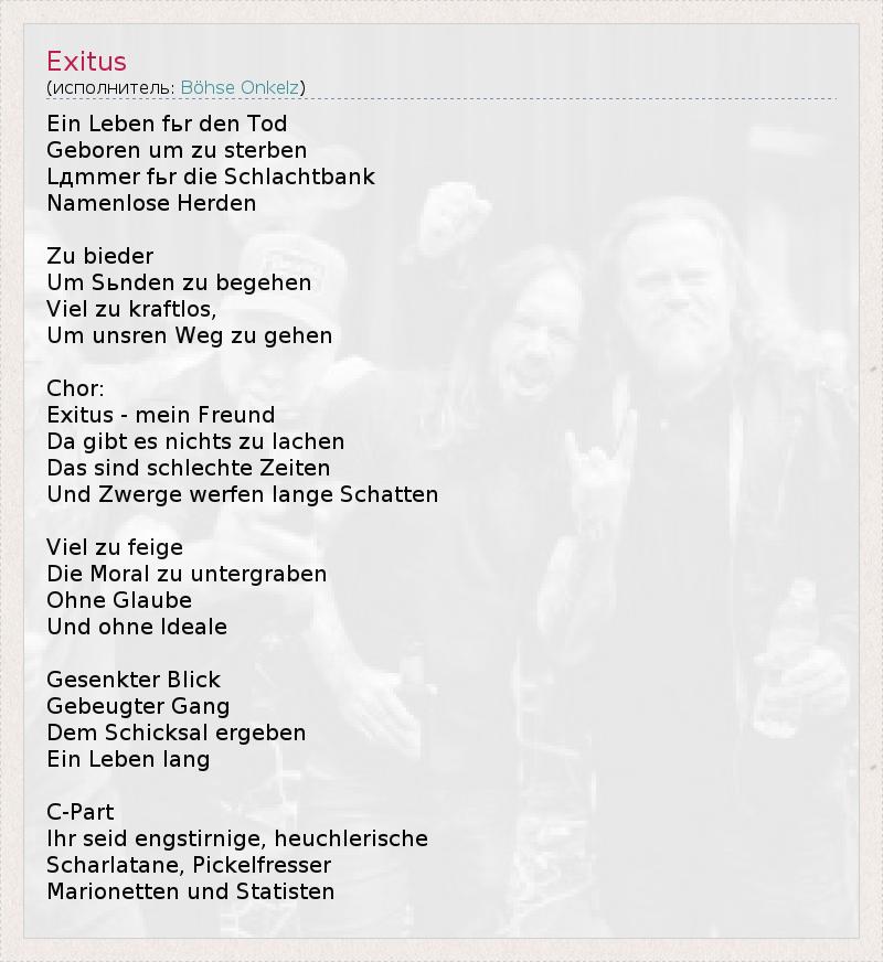 Ein Leben fьr den Tod Geboren um zu sterben Lдmmer fьr die Schlachtbank Namenlose Herden Zu bieder Um Sьnden zu begehen Viel zu kraftlos, Um unsren Weg zu gehen Chor: Exitus - mein Freund Da gibt es nichts zu lachen Das sind schlechte Zeiten Und Zwerge werfen lange Schatten Viel zu feige Die Moral zu untergraben Ohne Glaube Und ohne Ideale Gesenkter Blick Gebeugter Gang Dem Schicksal ergeben Ein Leben lang C-Part Ihr seid engstirnige, heuchlerische Scharlatane, Pickelfresser Marionetten und Statisten
