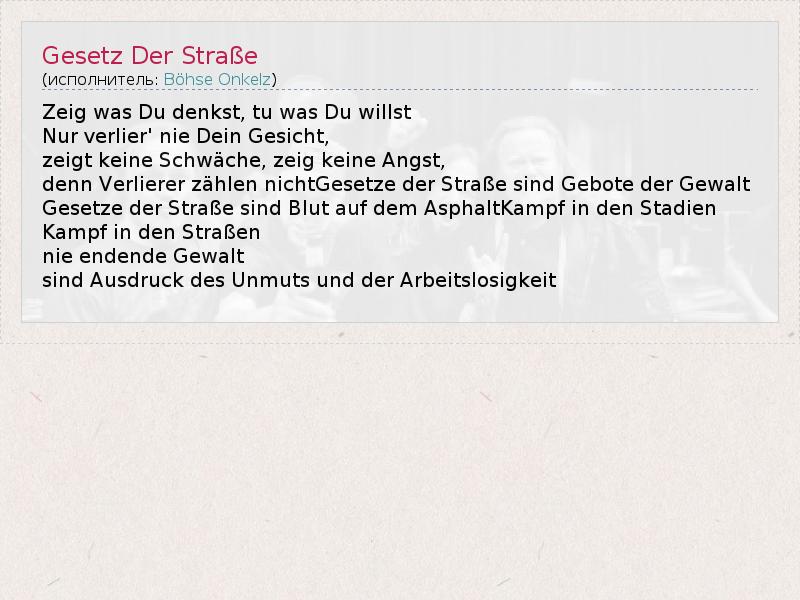 Zeig was Du denkst, tu was Du willst Nur verlier' nie Dein Gesicht, zeigt keine Schwäche, zeig keine Angst, denn Verlierer zählen nichtGesetze der Straße sind Gebote der Gewalt Gesetze der Straße sind Blut auf dem AsphaltKampf in den Stadien Kampf in den Straßen nie endende Gewalt sind Ausdruck des Unmuts und der Arbeitslosigkeit