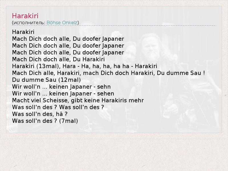 Harakiri Mach Dich doch alle, Du doofer Japaner Mach Dich doch alle, Du doofer Japaner Mach Dich doch alle, Du doofer Japaner Mach Dich doch alle, Du Harakiri Harakiri (13mal), Hara - Ha, ha, ha, ha ha - Harakiri Mach Dich alle, Harakiri, mach Dich doch Harakiri, Du dumme Sau ! Du dumme Sau (12mal) Wir woll'n ... keinen Japaner - sehn Wir woll'n ... keinen Japaner - sehen Macht viel Scheisse, gibt keine Harakiris mehr Was soll'n des ? Was soll'n des ? Was soll'n des, hä ? Was soll'n des ? (7mal)