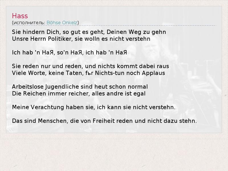 Sie hindern Dich, so gut es geht, Deinen Weg zu gehn Unsre Herrn Politiker, sie wolln es nicht verstehn Ich hab 'n HaЯ, so'n HaЯ, ich hab 'n HaЯ Sie reden nur und reden, und nichts kommt dabei raus Viele Worte, keine Taten, fьr Nichts-tun noch Applaus Arbeitslose Jugendliche sind heut schon normal Die Reichen immer reicher, alles andre ist egal Meine Verachtung haben sie, ich kann sie nicht verstehn. Das sind Menschen, die von Freiheit reden und nicht dazu stehn.
