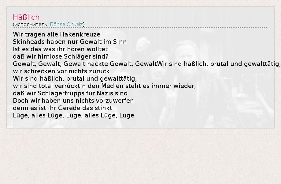 Wir tragen alle Hakenkreuze Skinheads haben nur Gewalt im Sinn Ist es das was ihr hören wolltet daß wir hirnlose Schläger sind? Gewalt, Gewalt, Gewalt nackte Gewalt, GewaltWir sind häßlich, brutal und gewalttätig, wir schrecken vor nichts zurück Wir sind häßlich, brutal und gewalttätig, wir sind total verrücktIn den Medien steht es immer wieder, daß wir Schlägertrupps für Nazis sind Doch wir haben uns nichts vorzuwerfen denn es ist ihr Gerede das stinkt Lüge, alles Lüge, Lüge, alles Lüge, Lüge