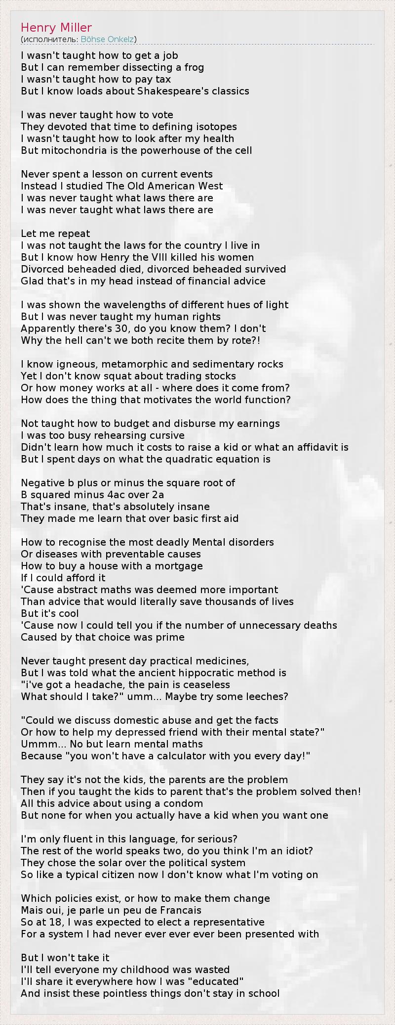 Меня не учили, как найти работу, Но я помню, как мы разрезАли лягушку. Меня не учили, как платить налоги, Но я знаю многое из Шекспира. Меня никогда не учили голосовать, Они посвятили это время определению изотопов. Меня не научили заботиться о своём здоровье, Но митохондрия - это источник энергии в клетке. 1 Никогда не было урока по текущим событиям. Вместо этого я изучал историю Старого Запада Америки. Меня никогда не учили тому, какие здесь законы, Меня никогда не учили тому, какие здесь законы. Дайте-ка повторю, Меня никогда не учили законам страны, в которой я живу, Но я знаю, как Генрих VIII убивал своих жён - Разведена, обезглавлена, умерла, разведена, обезглавлена, выжила. Рад, что эта информация в моей голове вместо финансовых рекомендаций. Мне показывали длину волн различных световых оттенков, Но меня никогда не учили моим человеческим правам. Вероятно, их 30, знаете ли вы их? Я нет. Почему же, чёрт побери, мы не можем рассказать их наизусть? Мне известны вулканические, метаморфические и осадочные горные породы. При этом я ни черта не знаю о товарных запасах Или о том, как устроен денежный механизм - как появились деньги? Как работает то, что движет всем миром? Меня не научили планировать бюджет и распределять свои доходы, Я был слишком занят, упражняясь в скорописи. Я не узнал, сколько стоит воспитать ребенка или что такое аффидевит, 2 Но потратил целые дни на квадратные уравнения. Отрицательное число b плюс/минус квадратный корень от b в квадрате минус 4ac, поделенное на 2a. Это лишено всякого смысла, совершенно лишено всякого смысла. Они заставляли меня учить всё это вместо основ оказания первой медицинской помощи. Как распознать самые опасные душевные расстройства Или заболевания, которые можно предупредить, Как купить дом в ипотеку, Если бы я мог себе это позволить. Но абстрактная математика считалась важнее Совета, который буквально спас бы тысячи жизней. Но это круто, Ведь теперь я мог бы сказать, было ли простым 3 число ненужных смертей, Случившихся по причине такого выбора. Меня никогда не учили современной практической медицине, Но мне рассказывали про старинный метод Гиппократа. "У меня болит голова, боль не прекращается, Что мне принять?" "Гм... Может, попробуете лечение пиявками?" "Может, обсудим проблему домашнего насилия и примем действительность, Или поговорим о том, как поддержать друга в депрессии?" Гммм... нет, учите математику, Потому что "не каждый день у вас под рукой будет калькулятор!" Говорят, проблема не в детях, а в родителях. Тогда, если научить детей вести себя, как взрослые, проблема будет решена! Все эти советы - по предохранению, Но нет ни одного на тот случай, когда у тебя уже есть ребёнок или когда ты хочешь его завести. Я свободно говорю только на одном языке, вы серьёзно? Весь остальной мир говорит на двух, думаете, я идиот? Они сделали выбор в пользу солнечной вместо политической системы. Так что, как среднестатистический гражданин, теперь я не знаю, за что голосую, Какие политические курсы существуют и как их поменять. Mais oui, je parle un peu de Francais 4 Так что в мои 18 лет от меня ждали, что я буду выбирать представителя Системы, с которой меня никогда-никогда не знакомили. Но я не сдамся, Я всем расскажу, что моё детство было растрачено впустую. Я поделюсь со всеми, как меня "обучали", И буду настаивать на том, чтобы эта бессмыслица не ост
