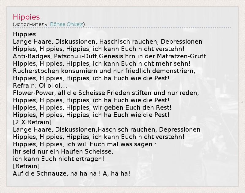Hippies Lange Haare, Diskussionen, Haschisch rauchen, Depressionen Hippies, Hippies, Hippies, ich kann Euch nicht verstehn! Anti-Badges, Patschuli-Duft,Genesis hrn in der Matratzen-Gruft Hippies, Hippies, Hippies, ich kann Euch nicht mehr sehn! Rucherstbchen konsumiern und nur friedlich demonstriern, Hippies, Hippies, Hippies, ich ha Euch wie die Pest! Refrain: Oi oi oi.... Flower-Power, all die Scheisse.Frieden stiften und nur reden, Hippies, Hippies, Hippies, ich ha Euch wie die Pest! Hippies, Hippies, Hippies, wir geben Euch den Rest! Hippies, Hippies, Hippies, ich ha Euch wie die Pest! [2 X Refrain] Lange Haare, Diskussionen,Haschisch rauchen, Depressionen Hippies, Hippies, Hippies, ich kann Euch nicht verstehn! Hippies, Hippies, ich will Euch mal was sagen : Ihr seid nur ein Haufen Scheisse, ich kann Euch nicht ertragen! [Refrain] Auf die Schnauze, ha ha ha ! A, ha ha!