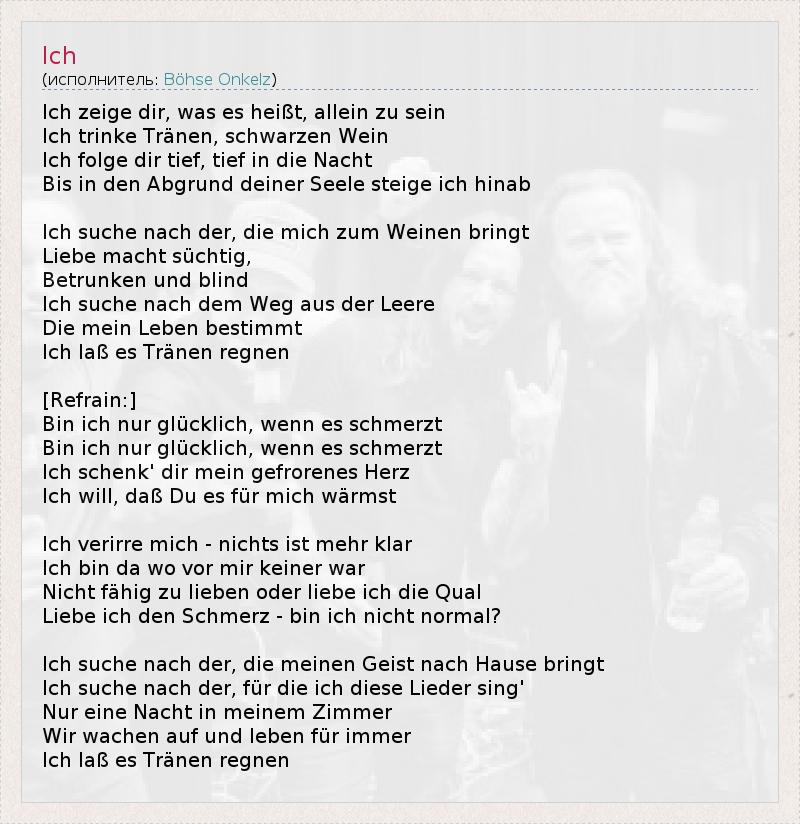 Ich zeige dir, was es heißt, allein zu sein Ich trinke Tränen, schwarzen Wein Ich folge dir tief, tief in die Nacht Bis in den Abgrund deiner Seele steige ich hinab Ich suche nach der, die mich zum Weinen bringt Liebe macht süchtig, Betrunken und blind Ich suche nach dem Weg aus der Leere Die mein Leben bestimmt Ich laß es Tränen regnen [Refrain:] Bin ich nur glücklich, wenn es schmerzt Bin ich nur glücklich, wenn es schmerzt Ich schenk' dir mein gefrorenes Herz Ich will, daß Du es für mich wärmst Ich verirre mich - nichts ist mehr klar Ich bin da wo vor mir keiner war Nicht fähig zu lieben oder liebe ich die Qual Liebe ich den Schmerz - bin ich nicht normal? Ich suche nach der, die meinen Geist nach Hause bringt Ich suche nach der, für die ich diese Lieder sing' Nur eine Nacht in meinem Zimmer Wir wachen auf und leben für immer Ich laß es Tränen regnen