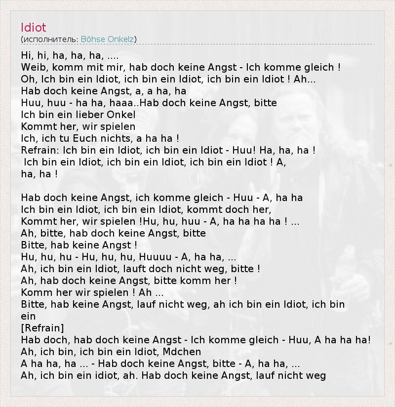 Hi, hi, ha, ha, ha, .... Weib, komm mit mir, hab doch keine Angst - Ich komme gleich ! Oh, Ich bin ein Idiot, ich bin ein Idiot, ich bin ein Idiot ! Ah... Hab doch keine Angst, a, a ha, ha Huu, huu - ha ha, haaa..Hab doch keine Angst, bitte Ich bin ein lieber Onkel Kommt her, wir spielen Ich, ich tu Euch nichts, a ha ha ! Refrain: Ich bin ein Idiot, ich bin ein Idiot - Huu! Ha, ha, ha ! Ich bin ein Idiot, ich bin ein Idiot, ich bin ein Idiot ! A, ha, ha ! Hab doch keine Angst, ich komme gleich - Huu - A, ha ha Ich bin ein Idiot, ich bin ein Idiot, kommt doch her, Kommt her, wir spielen !Hu, hu, huu - A, ha ha ha ha ! ... Ah, bitte, hab doch keine Angst, bitte Bitte, hab keine Angst ! Hu, hu, hu - Hu, hu, hu, Huuuu - A, ha ha, ... Ah, ich bin ein Idiot, lauft doch nicht weg, bitte ! Ah, hab doch keine Angst, bitte komm her ! Komm her wir spielen ! Ah ... Bitte, hab keine Angst, lauf nicht weg, ah ich bin ein Idiot, ich bin ein [Refrain] Hab doch, hab doch keine Angst - Ich komme gleich - Huu, A ha ha ha! Ah, ich bin, ich bin ein Idiot, Mdchen A ha ha, ha ... - Hab doch keine Angst, bitte - A, ha ha, ... Ah, ich bin ein idiot, ah. Hab doch keine Angst, lauf nicht weg