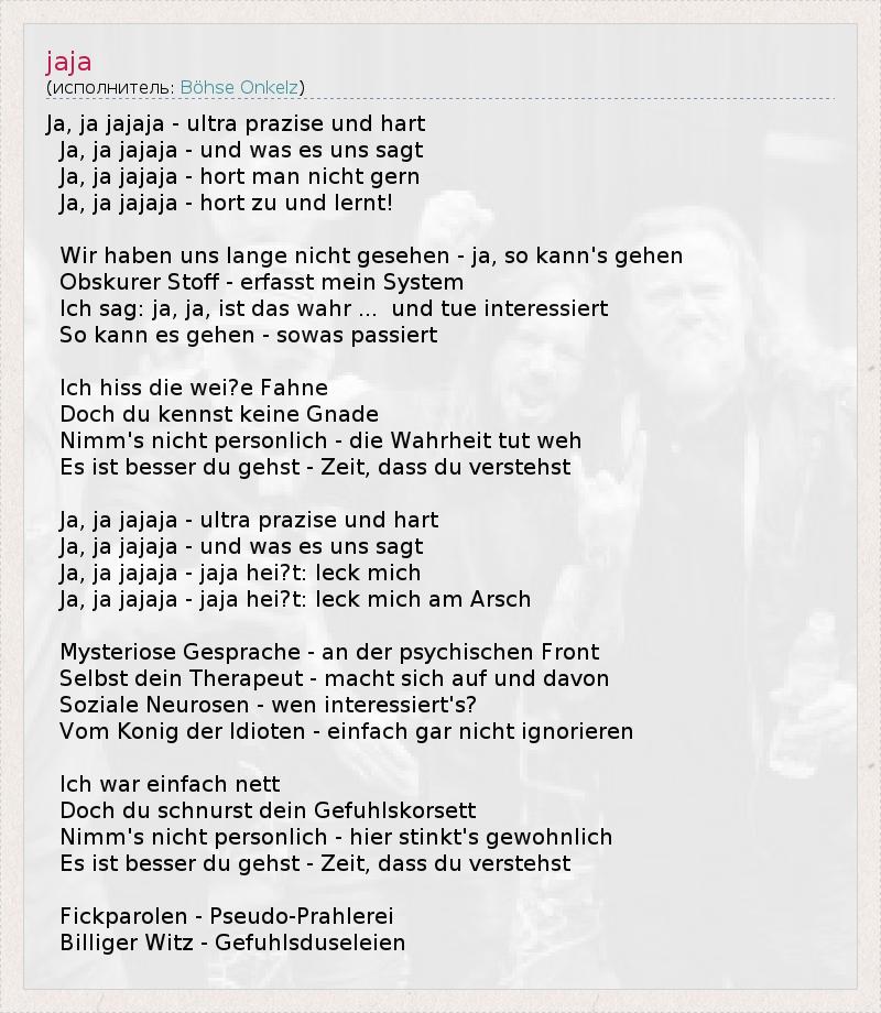 Ja, ja jajaja - ultra prazise und hart Ja, ja jajaja - und was es uns sagt Ja, ja jajaja - hort man nicht gern Ja, ja jajaja - hort zu und lernt! Wir haben uns lange nicht gesehen - ja, so kann's gehen Obskurer Stoff - erfasst mein System Ich sag: ja, ja, ist das wahr ... und tue interessiert So kann es gehen - sowas passiert Ich hiss die wei?e Fahne Doch du kennst keine Gnade Nimm's nicht personlich - die Wahrheit tut weh Es ist besser du gehst - Zeit, dass du verstehst Ja, ja jajaja - ultra prazise und hart Ja, ja jajaja - und was es uns sagt Ja, ja jajaja - jaja hei?t: leck mich Ja, ja jajaja - jaja hei?t: leck mich am Arsch Mysteriose Gesprache - an der psychischen Front Selbst dein Therapeut - macht sich auf und davon Soziale Neurosen - wen interessiert's? Vom Konig der Idioten - einfach gar nicht ignorieren Ich war einfach nett Doch du schnurst dein Gefuhlskorsett Nimm's nicht personlich - hier stinkt's gewohnlich Es ist besser du gehst - Zeit, dass du verstehst Fickparolen - Pseudo-Prahlerei Billiger Witz - Gefuhlsduseleien