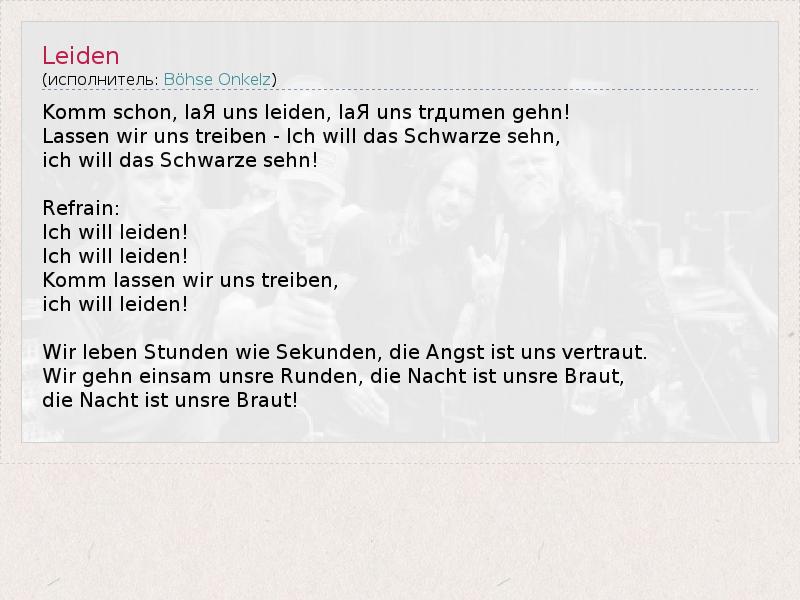 Komm schon, laЯ uns leiden, laЯ uns trдumen gehn! Lassen wir uns treiben - Ich will das Schwarze sehn, ich will das Schwarze sehn! Refrain: Ich will leiden! Ich will leiden! Komm lassen wir uns treiben, ich will leiden! Wir leben Stunden wie Sekunden, die Angst ist uns vertraut. Wir gehn einsam unsre Runden, die Nacht ist unsre Braut, die Nacht ist unsre Braut!