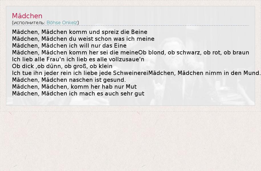 Mädchen, Mädchen komm und spreiz die Beine Mädchen, Mädchen du weist schon was ich meine Mädchen, Mädchen ich will nur das Eine Mädchen, Mädchen komm her sei die meineOb blond, ob schwarz, ob rot, ob braun Ich lieb alle Frau'n ich lieb es alle vollzusaue'n Ob dick ,ob dünn, ob groß, ob klein Ich tue ihn jeder rein ich liebe jede SchweinereiMädchen, Mädchen nimm in den Mund. Mädchen, Mädchen naschen ist gesund. Mädchen, Mädchen, komm her hab nur Mut Mädchen, Mädchen ich mach es auch sehr gut