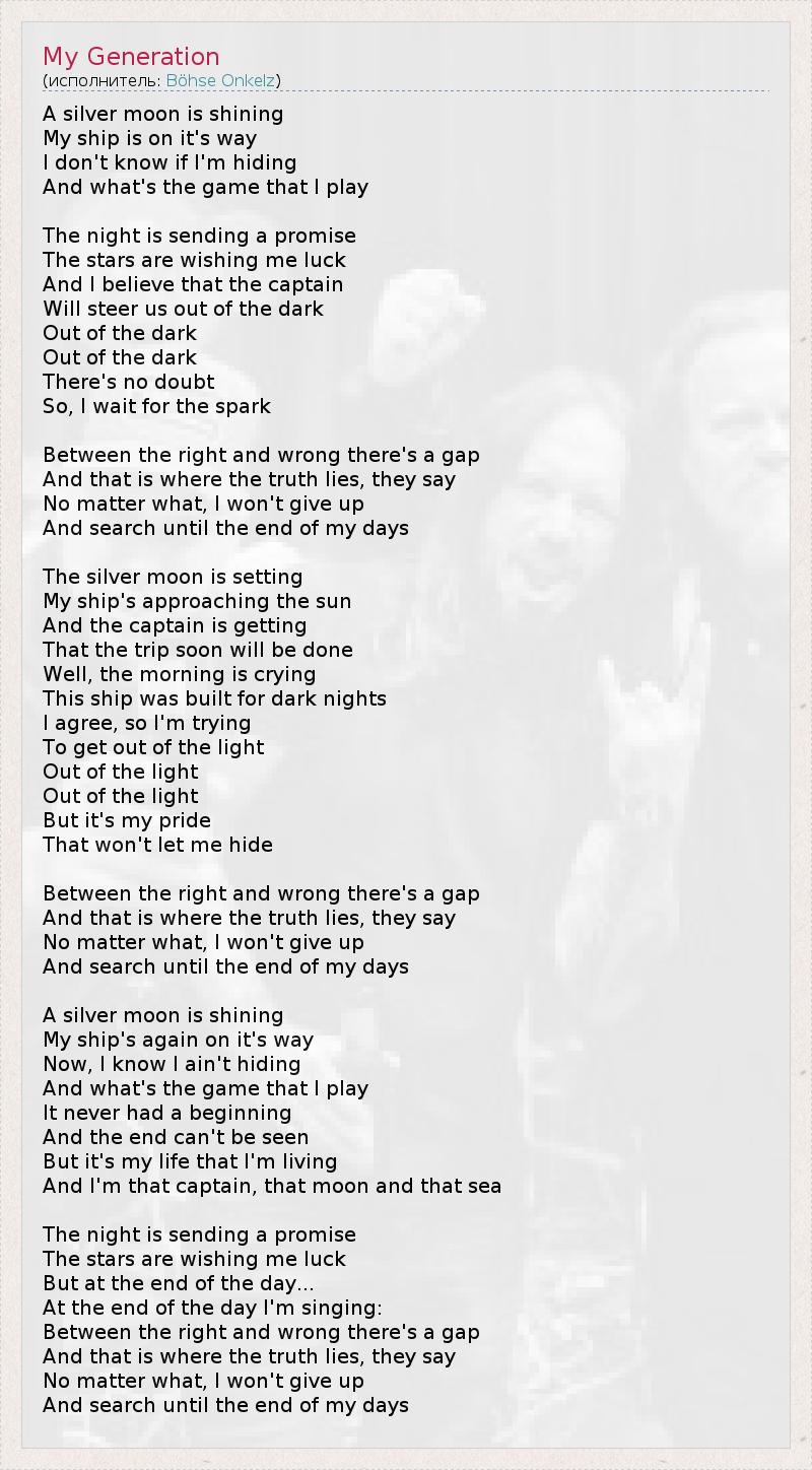 Сияет серебряная луна, Мой корабль на этом пути. Я не знаю, прячусь ли я И в какую игру играю. Ночь дает обещание, Звезды желают мне удачи, И я верю, что капитан Выведет нас из темноты, Из темноты, Из темноты, Никаких сомнений. И я жду проблеска надежды. Между верным и ложным есть промежуток, И, говорят, там лежит правда. Не важно что, я не уступлю И не буду искать это до конца моих дней. Серебряная луна заходит, Мой корабль приближается к солнцу, И капитан объявляет, Что путешествие скоро будет окончено. А утро плачет – Этот корабль был построен для темных ночей. Я согласен, и я пытаюсь Вывести его из света, Из света, Из света, Но моя гордость Не позволит мне прятаться. Между верным и ложным есть промежуток, И, говорят, там лежит правда. Не важно что, я не уступлю И не буду искать это до конца моих дней. Сияет серебряная луна, Мой корабль опять на этом пути. Теперь я знаю, что я не прячусь, И знаю, в какую игру играю. Она никогда не имела начала, И конца ей не видать, Но это моя жизнь, которую я живу, И я и этот капитан, и эта луна, и это море. Ночь дает обещание, Звезды желают мне удачи, Но в конце дня... В конце дня я пою: Между верным и ложным есть промежуток, И там, говорят, лежит правда. Не важно что, я не уступлю И не буду искать это до конца моих дней.