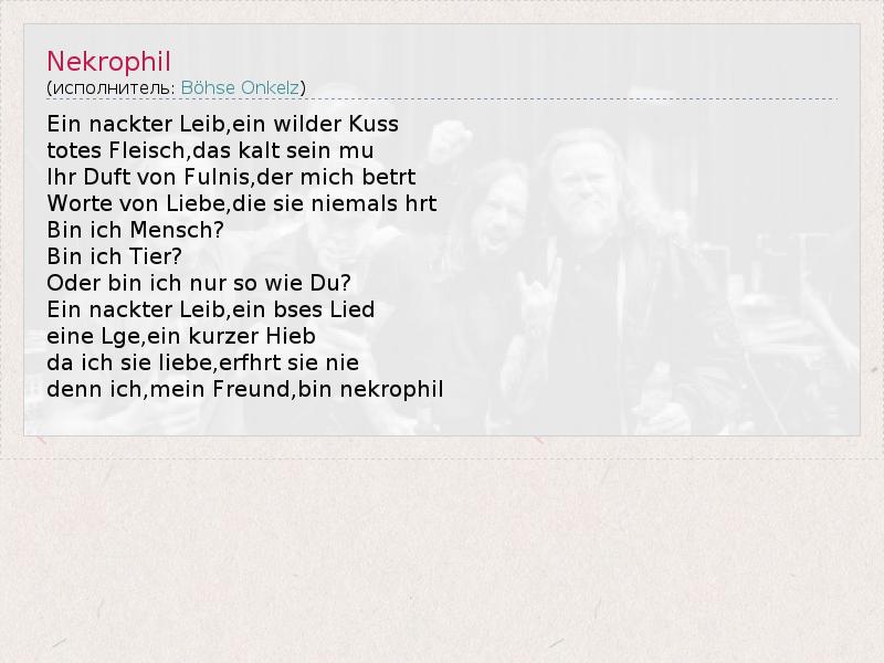 Ein nackter Leib,ein wilder Kuss totes Fleisch,das kalt sein mu Ihr Duft von Fulnis,der mich betrt Worte von Liebe,die sie niemals hrt Bin ich Mensch? Bin ich Tier? Oder bin ich nur so wie Du? Ein nackter Leib,ein bses Lied eine Lge,ein kurzer Hieb da ich sie liebe,erfhrt sie nie denn ich,mein Freund,bin nekrophil