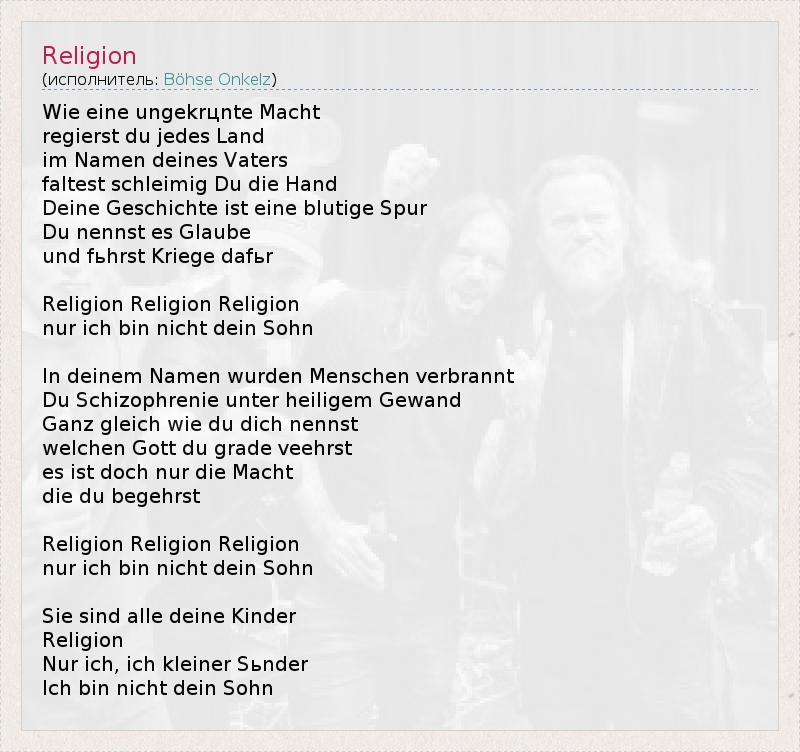 Wie eine ungekrцnte Macht regierst du jedes Land im Namen deines Vaters faltest schleimig Du die Hand Deine Geschichte ist eine blutige Spur Du nennst es Glaube und fьhrst Kriege dafьr Religion Religion Religion nur ich bin nicht dein Sohn In deinem Namen wurden Menschen verbrannt Du Schizophrenie unter heiligem Gewand Ganz gleich wie du dich nennst welchen Gott du grade veehrst es ist doch nur die Macht die du begehrst Religion Religion Religion nur ich bin nicht dein Sohn Sie sind alle deine Kinder Religion Nur ich, ich kleiner Sьnder Ich bin nicht dein Sohn