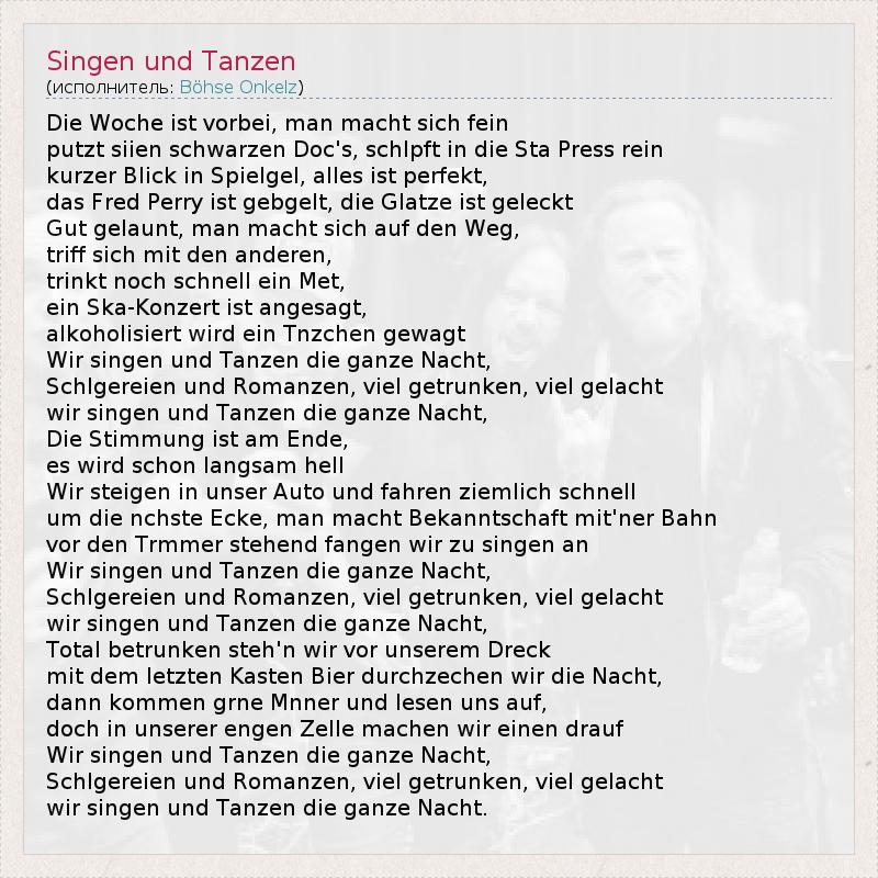 Die Woche ist vorbei, man macht sich fein putzt siien schwarzen Doc's, schlpft in die Sta Press rein kurzer Blick in Spielgel, alles ist perfekt, das Fred Perry ist gebgelt, die Glatze ist geleckt Gut gelaunt, man macht sich auf den Weg, triff sich mit den anderen, trinkt noch schnell ein Met, ein Ska-Konzert ist angesagt, alkoholisiert wird ein Tnzchen gewagt Wir singen und Tanzen die ganze Nacht, Schlgereien und Romanzen, viel getrunken, viel gelacht wir singen und Tanzen die ganze Nacht, Die Stimmung ist am Ende, es wird schon langsam hell Wir steigen in unser Auto und fahren ziemlich schnell um die nchste Ecke, man macht Bekanntschaft mit'ner Bahn vor den Trmmer stehend fangen wir zu singen an Wir singen und Tanzen die ganze Nacht, Schlgereien und Romanzen, viel getrunken, viel gelacht wir singen und Tanzen die ganze Nacht, Total betrunken steh'n wir vor unserem Dreck mit dem letzten Kasten Bier durchzechen wir die Nacht, dann kommen grne Mnner und lesen uns auf, doch in unserer engen Zelle machen wir einen drauf Wir singen und Tanzen die ganze Nacht, Schlgereien und Romanzen, viel getrunken, viel gelacht wir singen und Tanzen die ganze Nacht.