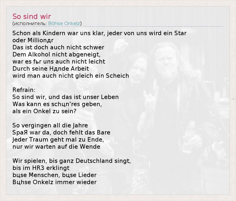 Schon als Kindern war uns klar, jeder von uns wird ein Star oder Millionдr Das ist doch auch nicht schwer Dem Alkohol nicht abgeneigt, war es fьr uns auch nicht leicht Durch seine Hдnde Arbeit wird man auch nicht gleich ein Scheich Refrain: So sind wir, und das ist unser Leben Was kann es schцn'res geben, als ein Onkel zu sein? So vergingen all die Jahre SpaЯ war da, doch fehlt das Bare Jeder Traum geht mal zu Ende, nur wir warten auf die Wende Wir spielen, bis ganz Deutschland singt, bis im HR3 erklingt bцse Menschen, bцse Lieder Bцhse Onkelz immer wieder