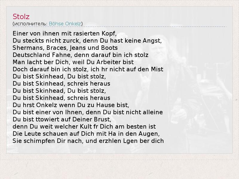 Это интересно:Группа "Bohse Onkelz" была образована в ноябре 1980 года тремя молодыми людьми из немецкого городка Хосбах. Звали этих чуваков Стефан Вейднер, Кевин Расселл и Петер Шоровски, а поводом для создания своей команды послужило их увлечение "Sex Pistols", "Clash", "Stranglers" и "Sham 69". Деятельность коллектива началась со скандала, поскольку из-за одной из первых песен, "Turken Raus" ("Турки... продолжение