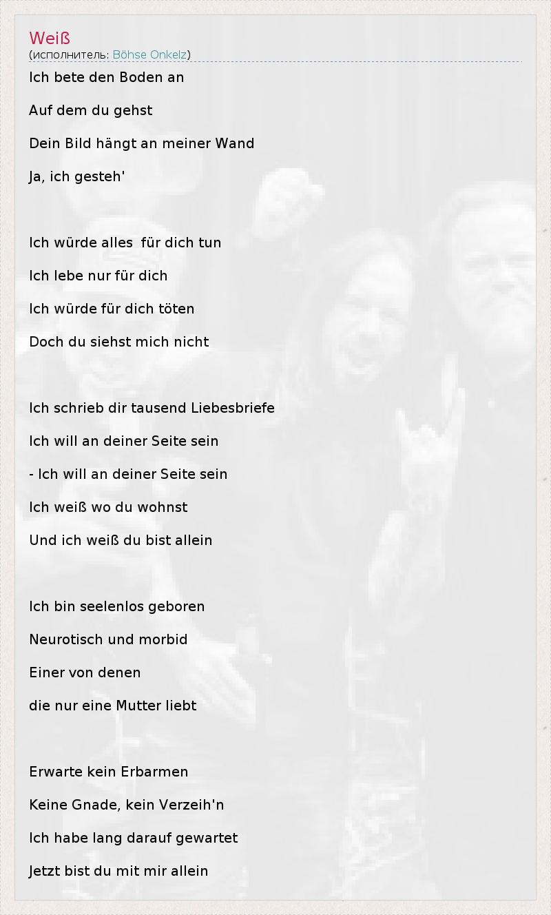 Ich bete den Boden an Auf dem du gehst Dein Bild hängt an meiner Wand Ja, ich gesteh' Ich würde alles für dich tun Ich lebe nur für dich Ich würde für dich töten Doch du siehst mich nicht Ich schrieb dir tausend Liebesbriefe Ich will an deiner Seite sein - Ich will an deiner Seite sein Ich weiß wo du wohnst Und ich weiß du bist allein Ich bin seelenlos geboren Neurotisch und morbid Einer von denen die nur eine Mutter liebt Erwarte kein Erbarmen Keine Gnade, kein Verzeih'n Ich habe lang darauf gewartet Jetzt bist du mit mir allein