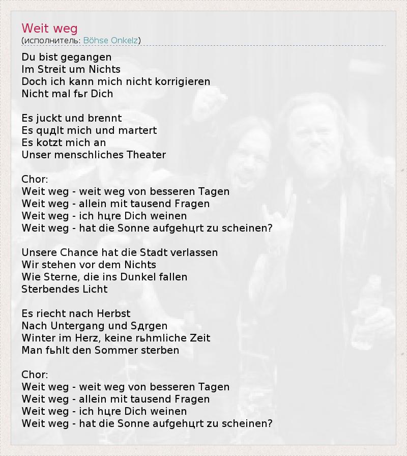 Du bist gegangen Im Streit um Nichts Doch ich kann mich nicht korrigieren Nicht mal fьr Dich Es juckt und brennt Es quдlt mich und martert Es kotzt mich an Unser menschliches Theater Chor: Weit weg - weit weg von besseren Tagen Weit weg - allein mit tausend Fragen Weit weg - ich hцre Dich weinen Weit weg - hat die Sonne aufgehцrt zu scheinen? Unsere Chance hat die Stadt verlassen Wir stehen vor dem Nichts Wie Sterne, die ins Dunkel fallen Sterbendes Licht Es riecht nach Herbst Nach Untergang und Sдrgen Winter im Herz, keine rьhmliche Zeit Man fьhlt den Sommer sterben Chor: Weit weg - weit weg von besseren Tagen Weit weg - allein mit tausend Fragen Weit weg - ich hцre Dich weinen Weit weg - hat die Sonne aufgehцrt zu scheinen?