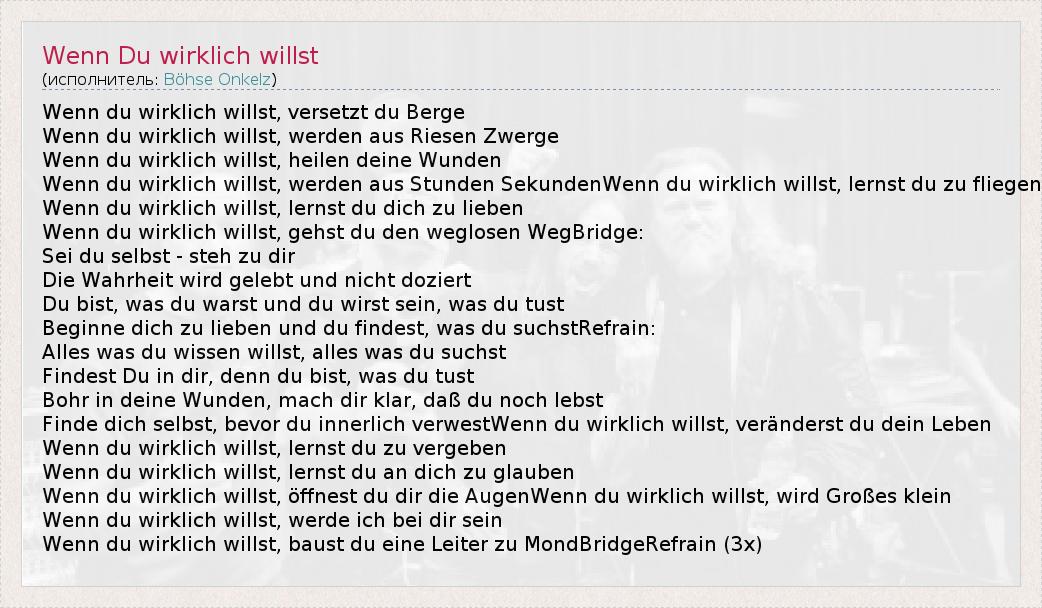 Wenn du wirklich willst, versetzt du Berge Wenn du wirklich willst, werden aus Riesen Zwerge Wenn du wirklich willst, heilen deine Wunden Wenn du wirklich willst, werden aus Stunden SekundenWenn du wirklich willst, lernst du zu fliegen Wenn du wirklich willst, lernst du dich zu lieben Wenn du wirklich willst, gehst du den weglosen WegBridge: Sei du selbst - steh zu dir Die Wahrheit wird gelebt und nicht doziert Du bist, was du warst und du wirst sein, was du tust Beginne dich zu lieben und du findest, was du suchstRefrain: Alles was du wissen willst, alles was du suchst Findest Du in dir, denn du bist, was du tust Bohr in deine Wunden, mach dir klar, daß du noch lebst Finde dich selbst, bevor du innerlich verwestWenn du wirklich willst, veränderst du dein Leben Wenn du wirklich willst, lernst du zu vergeben Wenn du wirklich willst, lernst du an dich zu glauben Wenn du wirklich willst, öffnest du dir die AugenWenn du wirklich willst, wird Großes klein Wenn du wirklich willst, werde ich bei dir sein Wenn du wirklich willst, baust du eine Leiter zu MondBridgeRefrain (3x)