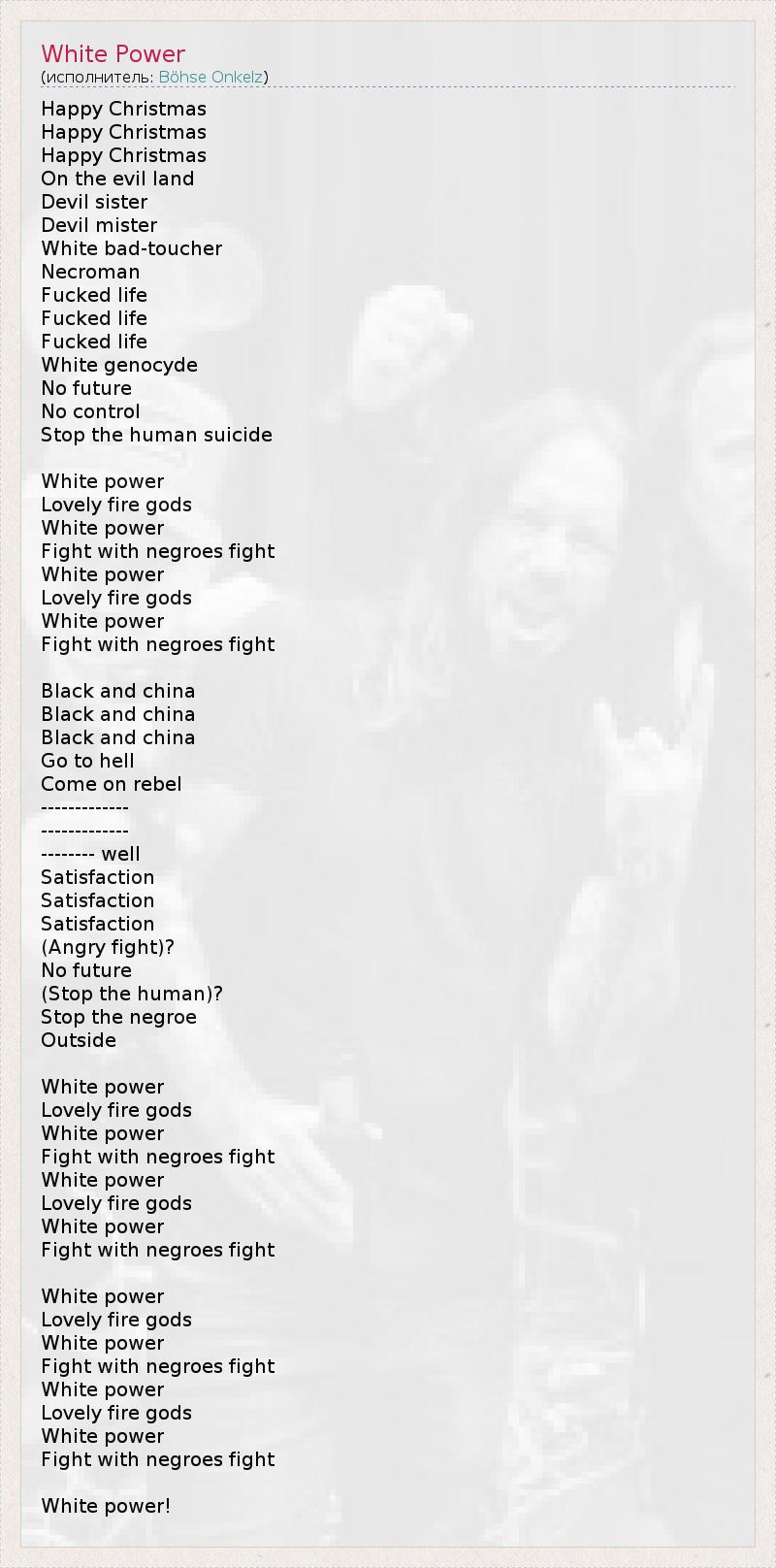 Happy Christmas Happy Christmas Happy Christmas On the evil land Devil sister Devil mister White bad-toucher Necroman Fucked life Fucked life Fucked life White genocyde No future No control Stop the human suicide White power Lovely fire gods White power Fight with negroes fight White power Lovely fire gods White power Fight with negroes fight Black and china Black and china Black and china Go to hell Come on rebel ------------- ------------- -------- well Satisfaction Satisfaction Satisfaction (Angry fight)? No future (Stop the human)? Stop the negroe Outside White power Lovely fire gods White power Fight with negroes fight White power Lovely fire gods White power Fight with negroes fight White power Lovely fire gods White power Fight with negroes fight White power Lovely fire gods White power Fight with negroes fight White power!