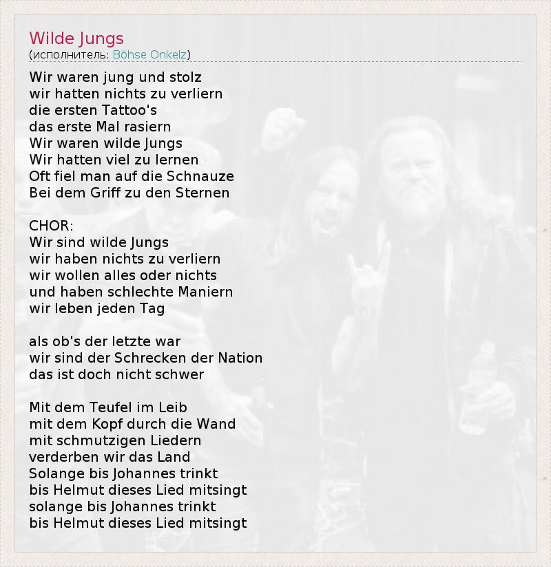 Wir Waren Чжун унд Штольц Wir Hatten Nichts цу verliern умереть Ersten татуировки дас Erste Mal rasiern Wir Waren Уайльд Jungs Wir Hatten Viel цу Lernen Oft Fiel человек Auf умереть Schnauze Бей дем Грифф цу ден Sternen CHOR : Wir Синд Уайльд Jungs Wir Haben Nichts цу verliern Wir Wollen Alles Одер Nichts унд Haben Schlechte Maniern Wir Leben Jeden тегов дер Letzte война ALS Оби Wir Синд дер Schrecken дер Нация дас ист DOCH Nicht Schwer Mit дем Teufel им Лейб мит дем Kopf Durch умереть палочку мит schmutzigen Liedern verderben Wir дас Земля Соланж бис Йоханнес trinkt бис Гельмут Dieses Lied mitsingt Соланж бис Йоханнес trinkt бис Гельмут Dieses Lied mitsingt