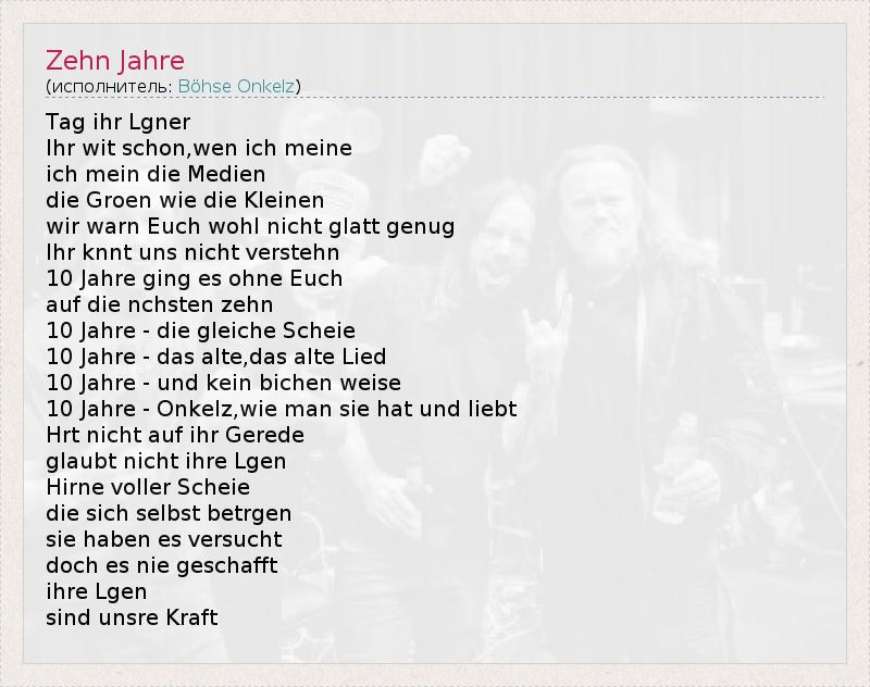 Tag ihr Lgner Ihr wit schon,wen ich meine ich mein die Medien die Groen wie die Kleinen wir warn Euch wohl nicht glatt genug Ihr knnt uns nicht verstehn 10 Jahre ging es ohne Euch auf die nchsten zehn 10 Jahre - die gleiche Scheie 10 Jahre - das alte,das alte Lied 10 Jahre - und kein bichen weise 10 Jahre - Onkelz,wie man sie hat und liebt Hrt nicht auf ihr Gerede glaubt nicht ihre Lgen Hirne voller Scheie die sich selbst betrgen sie haben es versucht doch es nie geschafft ihre Lgen sind unsre Kraft