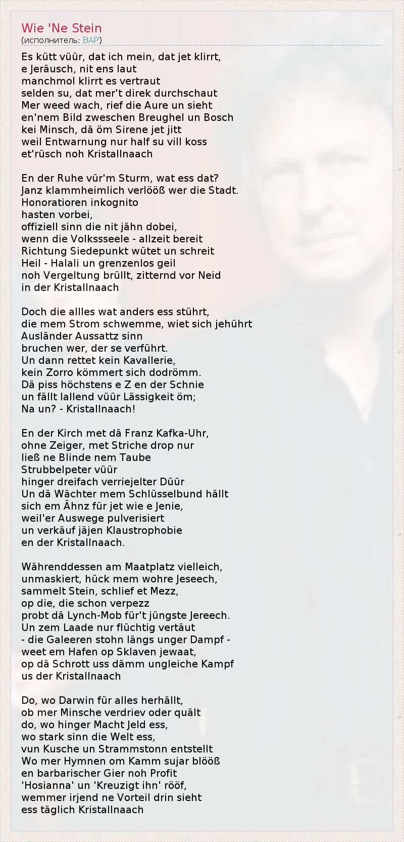 Es kütt vüür, dat ich mein, dat jet klirrt, e Jeräusch, nit ens laut manchmol klirrt es vertraut selden su, dat mer't direk durchschaut Mer weed wach, rief die Aure un sieht en'nem Bild zweschen Breughel un Bosch kei Minsch, dä öm Sirene jet jitt weil Entwarnung nur half su vill koss et'rüsch noh Kristallnaach En der Ruhe vür'm Sturm, wat ess dat? Janz klammheimlich verlööß wer die Stadt. Honoratioren inkognito hasten vorbei, offiziell sinn die nit jähn dobei, wenn die Volkssseele - allzeit bereit Richtung Siedepunkt wütet un schreit Heil - Halali un grenzenlos geil noh Vergeltung brüllt, zitternd vor Neid in der Kristallnaach Doch die allles wat anders ess stührt, die mem Strom schwemme, wiet sich jehührt Ausländer Aussattz sinn bruchen wer, der se verführt. Un dann rettet kein Kavallerie, kein Zorro kömmert sich dodrömm. Dä piss höchstens e Z en der Schnie un fällt lallend vüür Lässigkeit öm; Na un? - Kristallnaach! En der Kirch met dä Franz Kafka-Uhr, ohne Zeiger, met Striche drop nur ließ ne Blinde nem Taube Strubbelpeter vüür hinger dreifach verriejelter Düür Un dä Wächter mem Schlüsselbund hällt sich em Ähnz für jet wie e Jenie, weil'er Auswege pulverisiert un verkäuf jäjen Klaustrophobie en der Kristallnaach. Währenddessen am Maatplatz vielleich, unmaskiert, hück mem wohre Jeseech, sammelt Stein, schlief et Mezz, op die, die schon verpezz probt dä Lynch-Mob für't jüngste Jereech. Un zem Laade nur flüchtig vertäut - die Galeeren stohn längs unger Dampf - weet em Hafen op Sklaven jewaat, op dä Schrott uss dämm ungleiche Kampf us der Kristallnaach Do, wo Darwin für alles herhällt, ob mer Minsche verdriev oder quält do, wo hinger Macht Jeld ess, wo stark sinn die Welt ess, vun Kusche un Strammstonn entstellt Wo mer Hymnen om Kamm sujar blööß en barbarischer Gier noh Profit 'Hosianna' un 'Kreuzigt ihn' rööf, wemmer irjend ne Vorteil drin sieht ess täglich Kristallnaach
