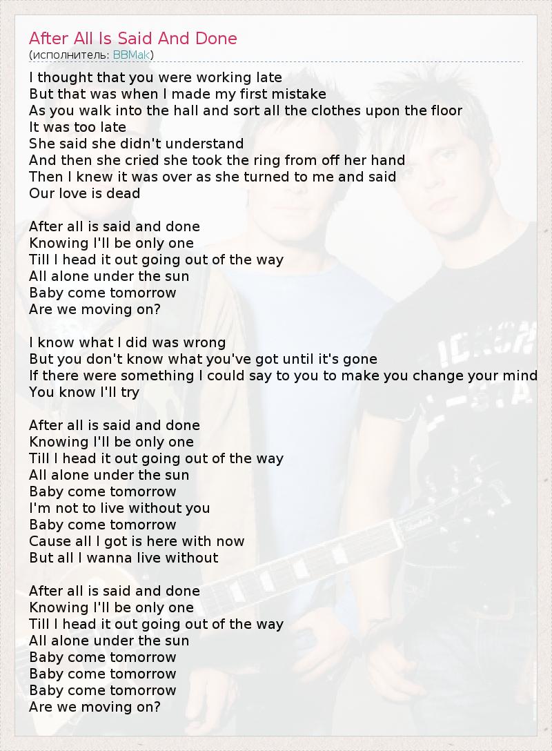 I thought that you were working late But that was when I made my first mistake As you walk into the hall and sort all the clothes upon the floor It was too late She said she didn't understand And then she cried she took the ring from off her hand Then I knew it was over as she turned to me and said Our love is dead After all is said and done Knowing I'll be only one Till I head it out going out of the way All alone under the sun Baby come tomorrow Are we moving on? I know what I did was wrong But you don't know what you've got until it's gone If there were something I could say to you to make you change your mind You know I'll try After all is said and done Knowing I'll be only one Till I head it out going out of the way All alone under the sun Baby come tomorrow I'm not to live without you Baby come tomorrow Cause all I got is here with now But all I wanna live without After all is said and done Knowing I'll be only one Till I head it out going out of the way All alone under the sun Baby come tomorrow Baby come tomorrow Baby come tomorrow Are we moving on?