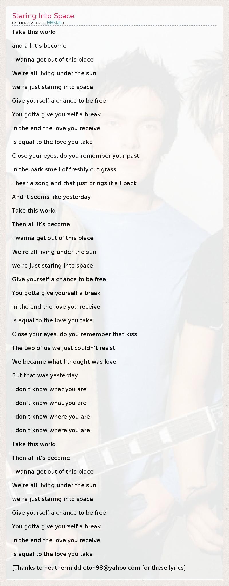 Take this world and all it's become I wanna get out of this place We're all living under the sun we're just staring into space Give yourself a chance to be free You gotta give yourself a break in the end the love you receive is equal to the love you take Close your eyes, do you remember your past In the park smell of freshly cut grass I hear a song and that just brings it all back And it seems like yesterday Take this world Then all it's become I wanna get out of this place We're all living under the sun we're just staring into space Give yourself a chance to be free You gotta give yourself a break in the end the love you receive is equal to the love you take Close your eyes, do you remember that kiss The two of us we just couldn't resist We became what I thought was love But that was yesterday I don't know what you are I don't know what you are I don't know where you are I don't know where you are Take this world Then all it's become I wanna get out of this place We're all living under the sun we're just staring into space Give yourself a chance to be free You gotta give yourself a break in the end the love you receive is equal to the love you take [Thanks to heathermiddleton98@yahoo.com for these lyrics]