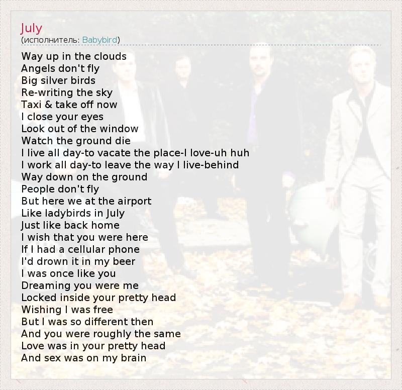 Way up in the clouds Angels don't fly Big silver birds Re-writing the sky Taxi & take off now I close your eyes Look out of the window Watch the ground die I live all day-to vacate the place-I love-uh huh I work all day-to leave the way I live-behind Way down on the ground People don't fly But here we at the airport Like ladybirds in July Just like back home I wish that you were here If I had a cellular phone I'd drown it in my beer I was once like you Dreaming you were me Locked inside your pretty head Wishing I was free But I was so different then And you were roughly the same Love was in your pretty head And sex was on my brain