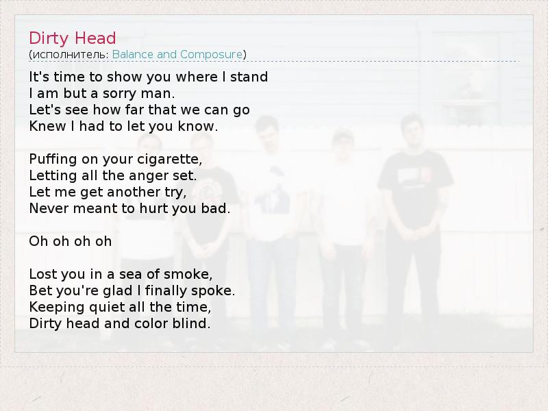 It's time to show you where I stand I am but a sorry man. Let's see how far that we can go Knew I had to let you know. Puffing on your cigarette, Letting all the anger set. Let me get another try, Never meant to hurt you bad. Oh oh oh oh Lost you in a sea of smoke, Bet you're glad I finally spoke. Keeping quiet all the time, Dirty head and color blind.