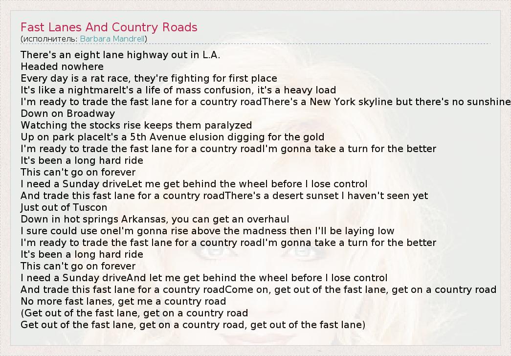 А как ты думаешь, о чем песня "Fast Lanes And Country Roads" ?
