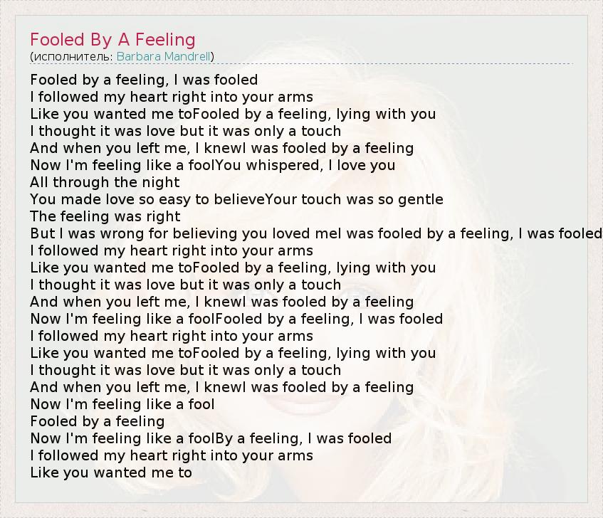 Fooled by a feeling, I was fooled I followed my heart right into your arms Like you wanted me toFooled by a feeling, lying with you I thought it was love but it was only a touch And when you left me, I knewI was fooled by a feeling Now I'm feeling like a foolYou whispered, I love you All through the night You made love so easy to believeYour touch was so gentle The feeling was right But I was wrong for believing you loved meI was fooled by a feeling, I was fooled I followed my heart right into your arms Like you wanted me toFooled by a feeling, lying with you I thought it was love but it was only a touch And when you left me, I knewI was fooled by a feeling Now I'm feeling like a foolFooled by a feeling, I was fooled I followed my heart right into your arms Like you wanted me toFooled by a feeling, lying with you I thought it was love but it was only a touch And when you left me, I knewI was fooled by a feeling Now I'm feeling like a fool Fooled by a feeling Now I'm feeling like a foolBy a feeling, I was fooled I followed my heart right into your arms Like you wanted me to