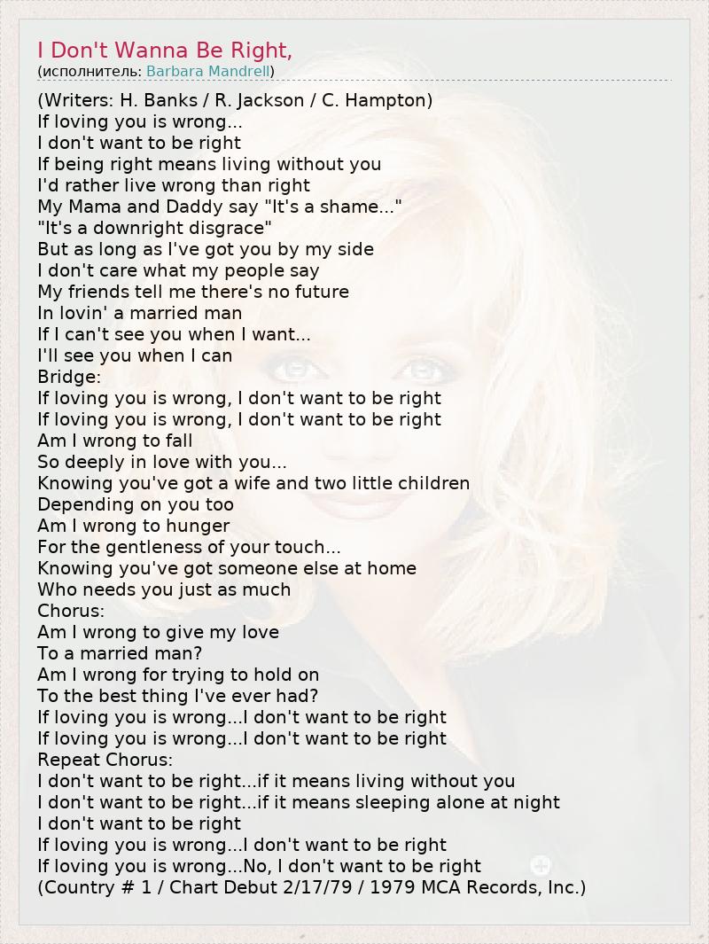 (Writers: H. Banks / R. Jackson / C. Hampton) If loving you is wrong... I don't want to be right If being right means living without you I'd rather live wrong than right My Mama and Daddy say "It's a shame..." "It's a downright disgrace" But as long as I've got you by my side I don't care what my people say My friends tell me there's no future In lovin' a married man If I can't see you when I want... I'll see you when I can Bridge: If loving you is wrong, I don't want to be right If loving you is wrong, I don't want to be right Am I wrong to fall So deeply in love with you... Knowing you've got a wife and two little children Depending on you too Am I wrong to hunger For the gentleness of your touch... Knowing you've got someone else at home Who needs you just as much Chorus: Am I wrong to give my love To a married man? Am I wrong for trying to hold on To the best thing I've ever had? If loving you is wrong...I don't want to be right If loving you is wrong...I don't want to be right Repeat Chorus: I don't want to be right...if it means living without you I don't want to be right...if it means sleeping alone at night I don't want to be right If loving you is wrong...I don't want to be right If loving you is wrong...No, I don't want to be right (Country # 1 / Chart Debut 2/17/79 / 1979 MCA Records, Inc.)