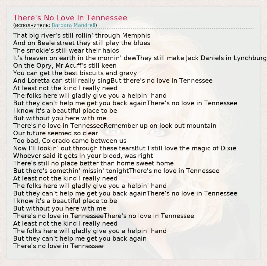 That big river's still rollin' through Memphis And on Beale street they still play the blues The smokie's still wear their halos It's heaven on earth in the mornin' dewThey still make Jack Daniels in Lynchburg On the Opry, Mr Acuff's still keen You can get the best biscuits and gravy And Loretta can still really singBut there's no love in Tennessee At least not the kind I really need The folks here will gladly give you a helpin' hand But they can't help me get you back againThere's no love in Tennessee I know it's a beautiful place to be But without you here with me There's no love in TennesseeRemember up on look out mountain Our future seemed so clear Too bad, Colorado came between us Now I'll lookin' out through these tearsBut I still love the magic of Dixie Whoever said it gets in your blood, was right There's still no place better than home sweet home But there's somethin' missin' tonightThere's no love in Tennessee At least not the kind I really need The folks here will gladly give you a helpin' hand But they can't help me get you back againThere's no love in Tennessee I know it's a beautiful place to be But without you here with me There's no love in TennesseeThere's no love in Tennessee At least not the kind I really need The folks here will gladly give you a helpin' hand But they can't help me get you back again There's no love in Tennessee