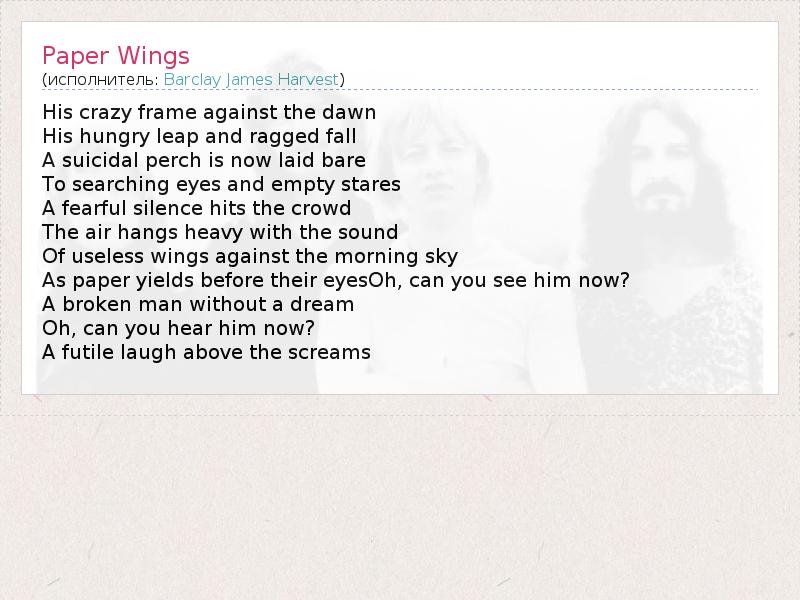 А как ты думаешь, о чем песня "Paper Wings" ?