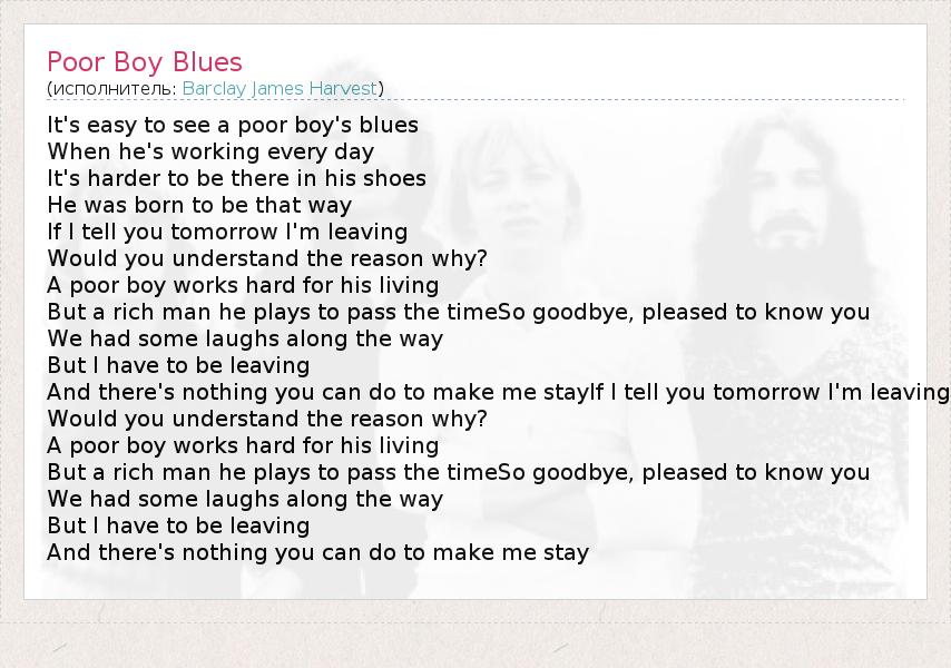 It's easy to see a poor boy's blues When he's working every day It's harder to be there in his shoes He was born to be that way If I tell you tomorrow I'm leaving Would you understand the reason why? A poor boy works hard for his living But a rich man he plays to pass the timeSo goodbye, pleased to know you We had some laughs along the way But I have to be leaving And there's nothing you can do to make me stayIf I tell you tomorrow I'm leaving Would you understand the reason why? A poor boy works hard for his living But a rich man he plays to pass the timeSo goodbye, pleased to know you We had some laughs along the way But I have to be leaving And there's nothing you can do to make me stay