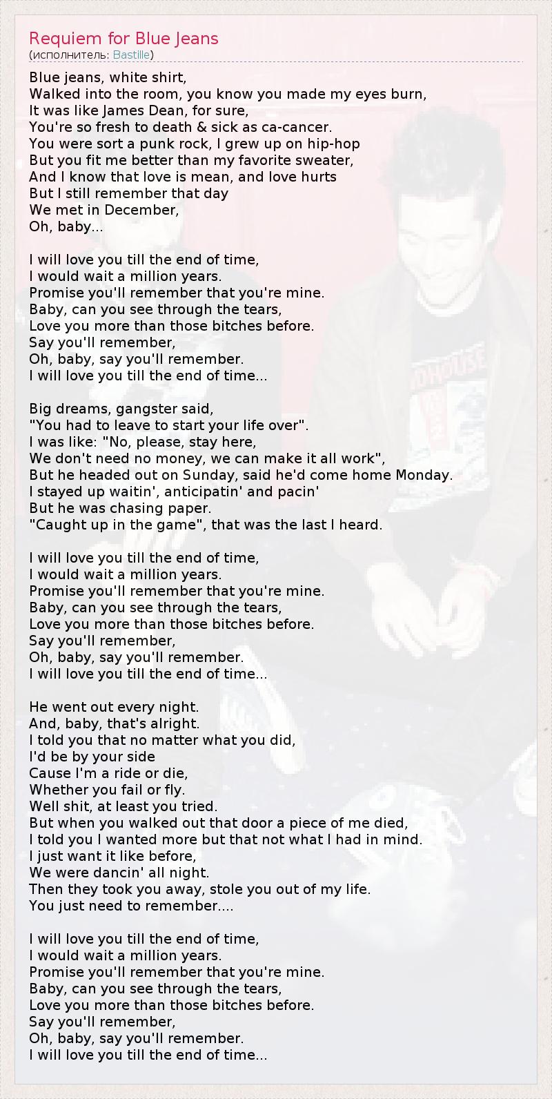 А как ты думаешь, о чем песня "Requiem for Blue Jeans" ?