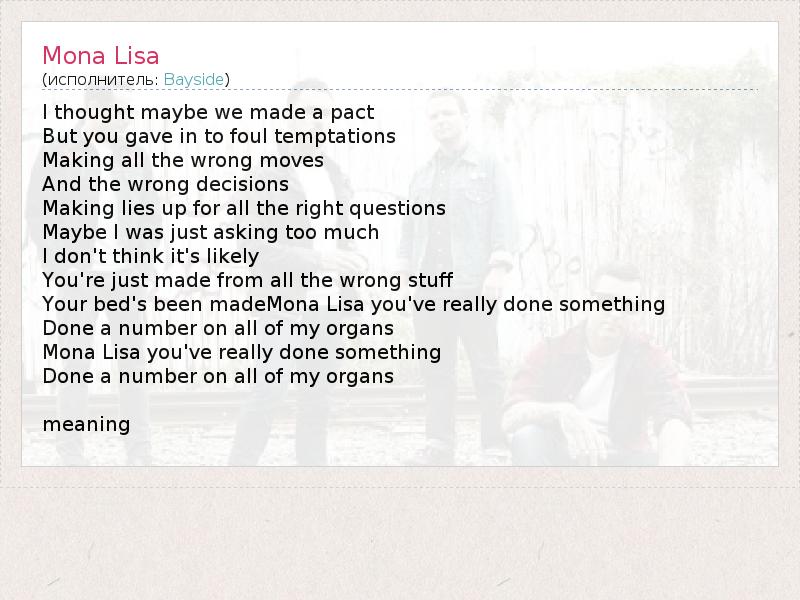 А как ты думаешь, о чем песня "Mona Lisa" ?