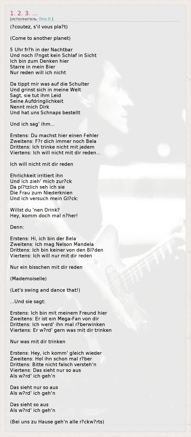 (?coutez, s'il vous pla?t) (Come to another planet) 5 Uhr fr?h in der Nachtbar Und noch l?ngst kein Schlaf in Sicht Ich bin zum Denken hier Starre in mein Bier Nur reden will ich nicht Da tippt mir was auf die Schulter Und grinst sich in meine Welt Sagt, sie tut ihm Leid Seine Aufdringlichkeit Nennt mich Dirk Und hat uns Schnaps bestellt Und ich sag' ihm... Erstens: Du machst hier einen Fehler Zweitens: F?r dich immer noch Bela Drittens: Ich trinke nicht mit jedem Viertens: Ich will nicht mit dir reden... Ich will nicht mit dir reden Ehrlichkeit irritiert ihn Und ich zieh' mich zur?ck Da pl?tzlich seh ich sie Die Frau zum Niederknien Und ich versuch mein Gl?ck: Willst du 'nen Drink? Hey, komm doch mal n?her! Denn: Erstens: Hi, ich bin der Bela Zweitens: Ich mag Nelson Mandela Drittens: Ich bin keiner von den Bl?den Viertens: Ich will nur mit dir reden Nur ein bisschen mit dir reden (Mademoiselle) (Let's swing and dance that!) ...Und sie sagt: Erstens: Ich bin mit meinem Freund hier Zweitens: Er ist ein Mega-Fan von dir Drittens: Ich werd' ihn mal r?berwinken Viertens: Er w?rd' gern was mit dir trinken Nur was mit dir trinken Erstens: Hey, ich komm' gleich wieder Zweitens: Hol ihn schon mal r?ber Drittens: Bitte nicht falsch versteh'n Viertens: Das sieht nur so aus Als w?rd' ich geh'n Das sieht nur so aus Als w?rd' ich geh'n Das sieht so aus Als w?rd' ich geh'n (Bei uns zu Hause geh'n alle r?ckw?rts)