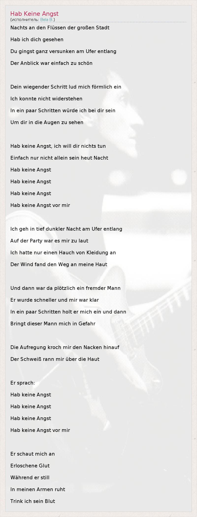 Nachts an den Flüssen der großen Stadt Hab ich dich gesehen Du gingst ganz versunken am Ufer entlang Der Anblick war einfach zu schön Dein wiegender Schritt lud mich förmlich ein Ich konnte nicht widerstehen In ein paar Schritten würde ich bei dir sein Um dir in die Augen zu sehen Hab keine Angst, ich will dir nichts tun Einfach nur nicht allein sein heut Nacht Hab keine Angst Hab keine Angst Hab keine Angst Hab keine Angst vor mir Ich geh in tief dunkler Nacht am Ufer entlang Auf der Party war es mir zu laut Ich hatte nur einen Hauch von Kleidung an Der Wind fand den Weg an meine Haut Und dann war da plötzlich ein fremder Mann Er wurde schneller und mir war klar In ein paar Schritten holt er mich ein und dann Bringt dieser Mann mich in Gefahr Die Aufregung kroch mir den Nacken hinauf Der Schweiß rann mir über die Haut Er sprach: Hab keine Angst Hab keine Angst Hab keine Angst Hab keine Angst vor mir Er schaut mich an Erloschene Glut Während er still In meinen Armen ruht Trink ich sein Blut
