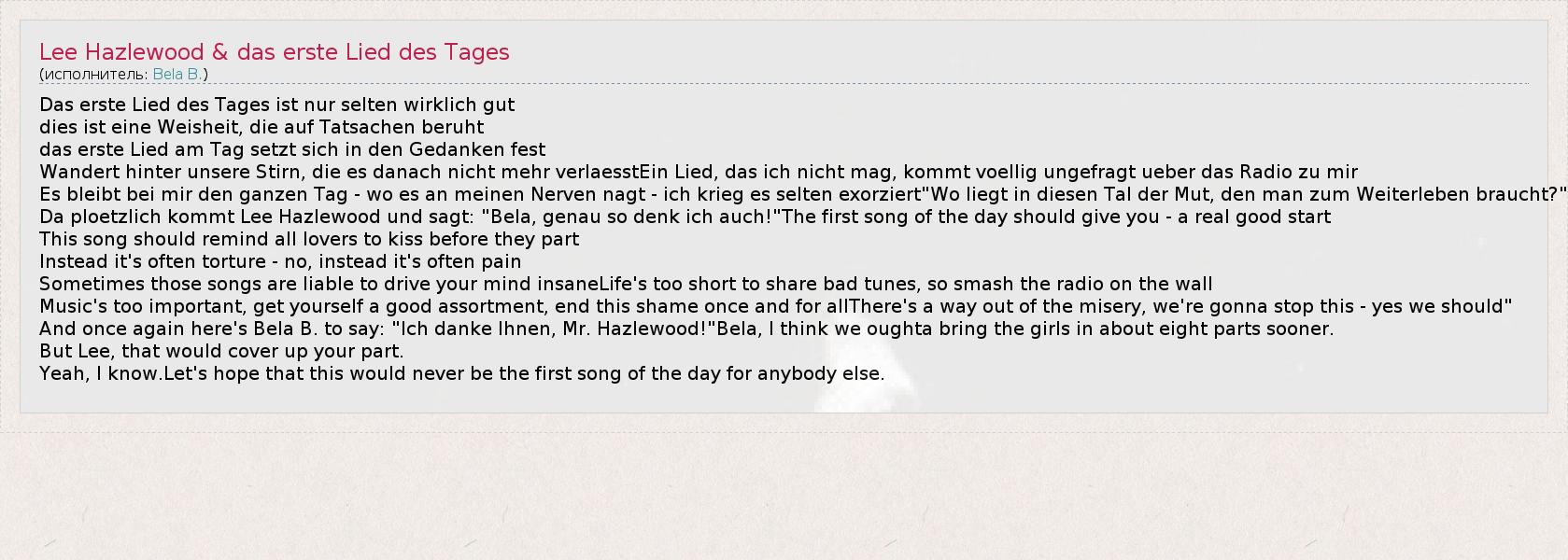 Das erste Lied des Tages ist nur selten wirklich gut dies ist eine Weisheit, die auf Tatsachen beruht das erste Lied am Tag setzt sich in den Gedanken fest Wandert hinter unsere Stirn, die es danach nicht mehr verlaesstEin Lied, das ich nicht mag, kommt voellig ungefragt ueber das Radio zu mir Es bleibt bei mir den ganzen Tag - wo es an meinen Nerven nagt - ich krieg es selten exorziert"Wo liegt in diesen Tal der Mut, den man zum Weiterleben braucht?" Da ploetzlich kommt Lee Hazlewood und sagt: "Bela, genau so denk ich auch!"The first song of the day should give you - a real good start This song should remind all lovers to kiss before they part Instead it's often torture - no, instead it's often pain Sometimes those songs are liable to drive your mind insaneLife's too short to share bad tunes, so smash the radio on the wall Music's too important, get yourself a good assortment, end this shame once and for allThere's a way out of the misery, we're gonna stop this - yes we should" And once again here's Bela B. to say: "Ich danke Ihnen, Mr. Hazlewood!"Bela, I think we oughta bring the girls in about eight parts sooner. But Lee, that would cover up your part. Yeah, I know.Let's hope that this would never be the first song of the day for anybody else.