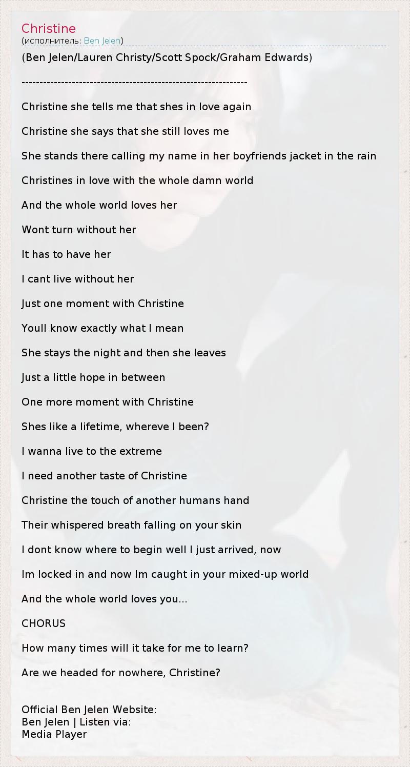 (Ben Jelen/Lauren Christy/Scott Spock/Graham Edwards) --------------------------------------------------------------- Christine she tells me that shes in love again Christine she says that she still loves me She stands there calling my name in her boyfriends jacket in the rain Christines in love with the whole damn world And the whole world loves her Wont turn without her It has to have her I cant live without her Just one moment with Christine Youll know exactly what I mean She stays the night and then she leaves Just a little hope in between One more moment with Christine Shes like a lifetime, whereve I been? I wanna live to the extreme I need another taste of Christine Christine the touch of another humans hand Their whispered breath falling on your skin I dont know where to begin well I just arrived, now Im locked in and now Im caught in your mixed-up world And the whole world loves you... CHORUS How many times will it take for me to learn? Are we headed for nowhere, Christine? Official Ben Jelen Website: Ben Jelen | Listen via: Media Player