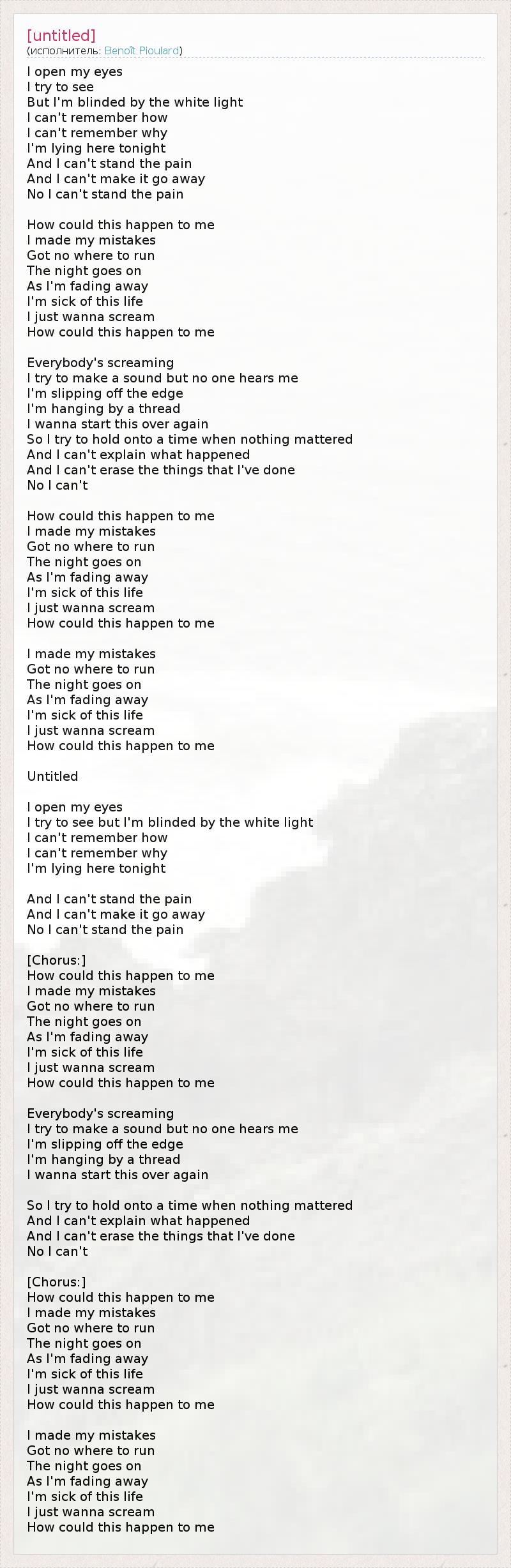 Глаза свои я открываю, Но чувствую, что видеть прекращаю. Во всем виновен этот свет И от него покоя нет. Сейчас я вспомнить не могу, Как ночью оказался я в аду. И эту боль уж не могу унять, Да и сейчас я не могу бежать. И эту боль я не смогу унять. Как со мной это случилось? Столько ошибок вдруг свершилось. Не куда теперь бежать, Ночь не станет помогать. Все я силы потерял, Так от жизни я устал. Я способен лишь кричать, Что случилось, хочу знать. Я слышу гул от голосов, Я сквозь него не слышу своих слов. На волоске, на грани, на пределе. Я так хочу начать сначала, В самом деле. О, как вернуть то время безмятежного покоя? Я не могу ведь описать, что же стряслось такое. И как стереть из памяти моей События давно минувших дней? Как со мной это случилось? Столько ошибок вдруг свершилось. Не куда теперь бежать, Ночь не станет помогать. Все я силы потерял, Так от жизни я устал. Я способен лишь кричать, Что случилось, хочу знать. Столько ошибок вдруг свершилось. Не куда теперь бежать, Ночь не станет помогать. Все я силы потерял, Так от жизни я устал. Я способен лишь кричать, Что случилось, хочу знать. Без названия (перевод лорд_Генри из Москвы) Я открываю глаза, Я пытаюсь посмотреть, но я ослеплен белым светом... Я не могу вспомнить, как, Я не могу вспомнить, почему Я лежу здесь сейчас... И я не могу вынести эту боль, Не могу прогнать ее, Нет, я не могу вынести эту боль... [Припев:] Как это могло случиться со мной? Я совершил свои ошибки, Бежать некуда. Ночь не прекращается,, И я постепенно исчезаю.... Я устал от этой жизни, Мне просто хочется кричать... Как это могло случиться со мной? Все кричат, Я пытаюсь произнести хоть звук, но меня никто не слышит.... Я скольжу по краю, Я держусь на волоске, Я хочу начать все с начала... И я пытаюсь держаться за времена, когда ничто не имело значения. Я не могу объяснить, что случилось, Не могу отменить того, что совершил, Нет, я не могу.... [Припев:] Как это могло случиться со мной? Я совершил свои ошибки, Бежать некуда. Ночь не прекращается,, И я постепенно исчезаю.... Я устал от этой жизни, Мне просто хочется кричать... Как это могло случиться со мной? Я совершил свои ошибки, Бежать некуда. Ночь не прекращается,, И я постепенно исчезаю.... Я устал от этой жизни, Мне просто хочется кричать... Как это могло случиться со мной?
