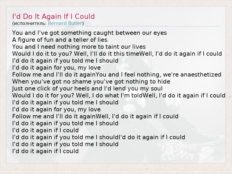 You and I've got something caught between our eyes A figure of fun and a teller of lies You and I need nothing more to taint our lives Would I do it to you? Well, I'll do it this timeWell, I'd do it again if I could I'd do it again if you told me I should I'd do it again for you, my love Follow me and I'll do it againYou and I feel nothing, we're anaesthetized When you've got no shame you've got nothing to hide Just one click of your heels and I'd lend you my soul Would I do it for you? Well, I do what I'm toldWell, I'd do it again if I could I'd do it again if you told me I should I'd do it again for you, my love Follow me and I'll do it againWell, I'd do it again if I could I'd do it again if you told me I should I'd do it again if I could I'd do it again if you told me I shouldI'd do it again if I could I'd do it again if you told me I should I'd do it again if I could