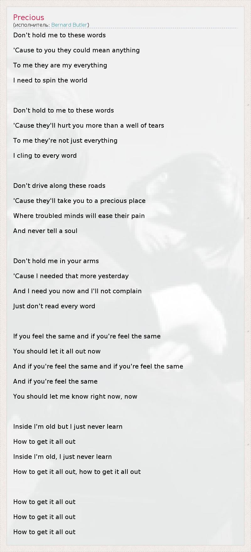 Don't hold me to these words 'Cause to you they could mean anything To me they are my everything I need to spin the world Don't hold to me to these words 'Cause they'll hurt you more than a well of tears To me they're not just everything I cling to every word Don't drive along these roads 'Cause they'll take you to a precious place Where troubled minds will ease their pain And never tell a soul Don't hold me in your arms 'Cause I needed that more yesterday And I need you now and I'll not complain Just don't read every word If you feel the same and if you're feel the same You should let it all out now And if you're feel the same and if you're feel the same And if you're feel the same You should let me know right now, now Inside I'm old but I just never learn How to get it all out Inside I'm old, I just never learn How to get it all out, how to get it all out How to get it all out How to get it all out How to get it all out