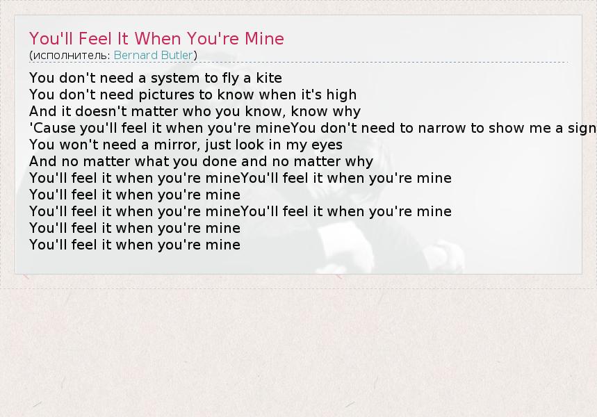 You don't need a system to fly a kite You don't need pictures to know when it's high And it doesn't matter who you know, know why 'Cause you'll feel it when you're mineYou don't need to narrow to show me a sign You won't need a mirror, just look in my eyes And no matter what you done and no matter why You'll feel it when you're mineYou'll feel it when you're mine You'll feel it when you're mine You'll feel it when you're mineYou'll feel it when you're mine You'll feel it when you're mine You'll feel it when you're mine