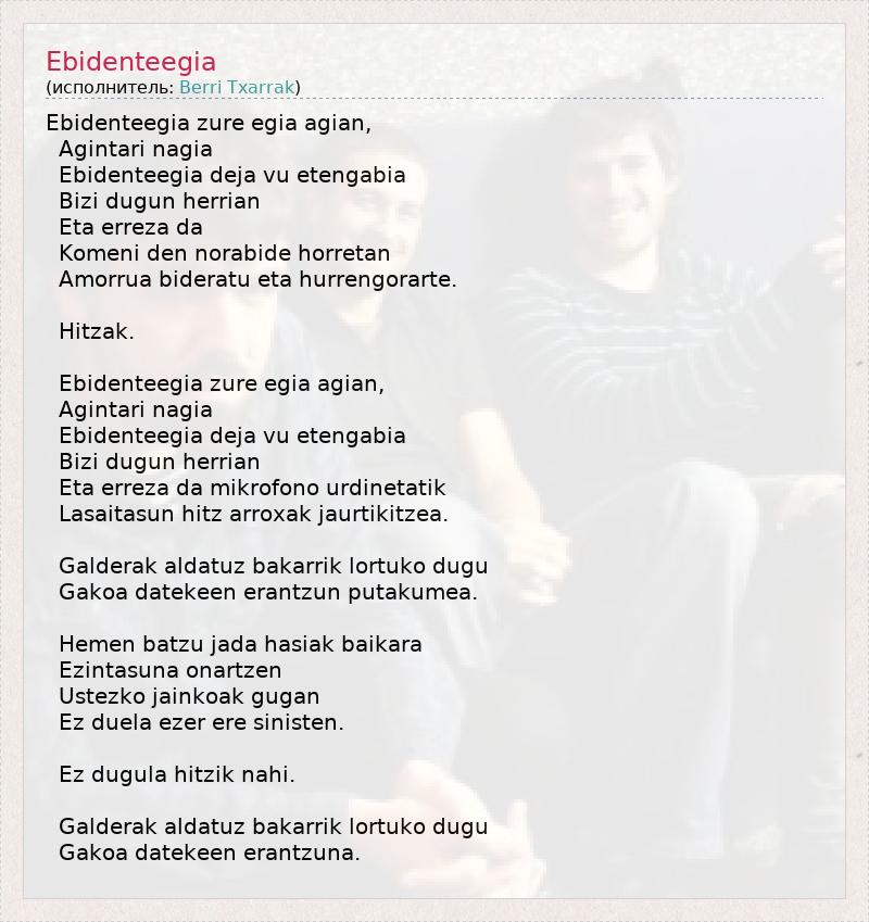 Это интересно:Berri Txarrak (баск. "Плохие новости") - испанская группа из Наварры, исполняющая музыку в стиле альтернативный рок / панк/ нью метал. Группа была основана в городе Лекумберри в 1994 году. Коллектив изначально являлся сайд-проектом музыкантов Gorka Urbizu (вокал, гитара) и Aitor Goikoetxea (ударные). В 1997 году они стали уделять все больше внимания своей группе, к которой также присоединились новые участники:... продолжение