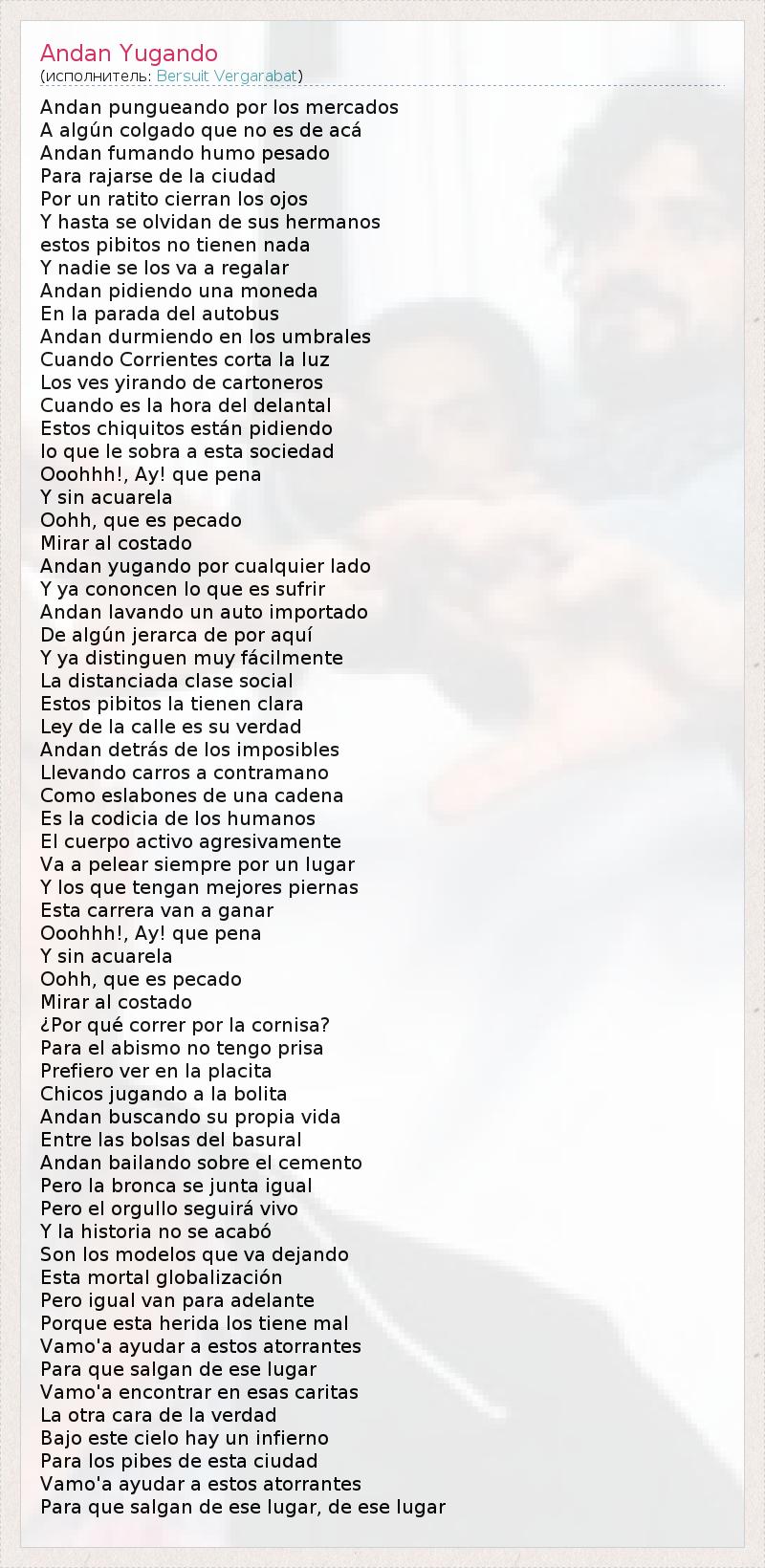 Это интересно:Bersuit Vergarabat, сформировались в 1989 в Аргентине и являются одними из наиболее известных исполнителей латинского рока 90-х.После 2 х андеграундовых альбомов, группа стала смешивать рок с латиноамериканскими ритмами такими как кумбиа(колумбийский народный танец), чакарера(испанский танец), кандомбе(негритянский танец под барабаны) и куртетанзо(тоже латинский... продолжение