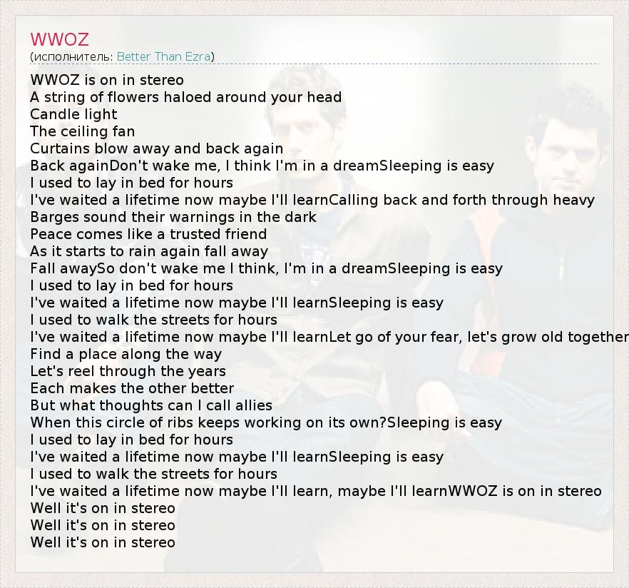 I've waited a lifetime now maybe I'll learn, maybe I'll learnWWOZ is on in stereo