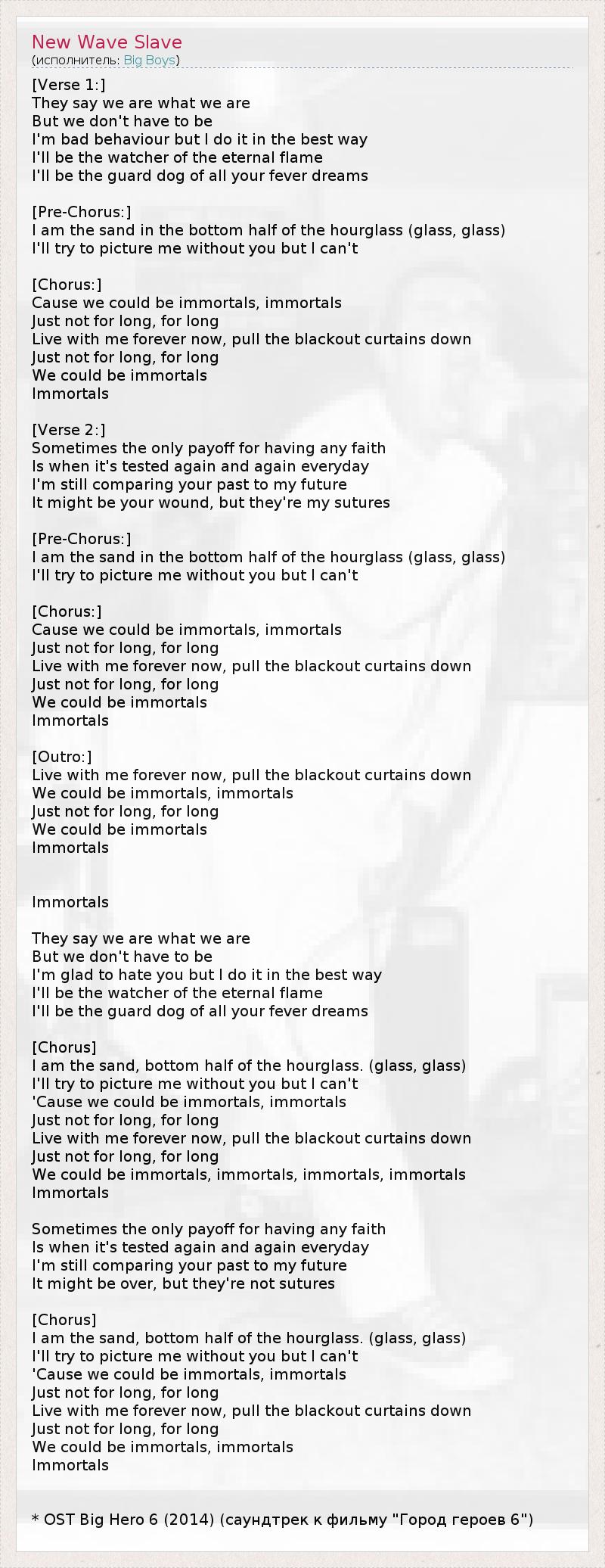 [Verse 1:] They say we are what we are But we don't have to be I'm bad behaviour but I do it in the best way I'll be the watcher of the eternal flame I'll be the guard dog of all your fever dreams [Pre-Chorus:] I am the sand in the bottom half of the hourglass (glass, glass) I'll try to picture me without you but I can't [Chorus:] Cause we could be immortals, immortals Just not for long, for long Live with me forever now, pull the blackout curtains down Just not for long, for long We could be immortals Immortals [Verse 2:] Sometimes the only payoff for having any faith Is when it's tested again and again everyday I'm still comparing your past to my future It might be your wound, but they're my sutures [Pre-Chorus:] I am the sand in the bottom half of the hourglass (glass, glass) I'll try to picture me without you but I can't [Chorus:] Cause we could be immortals, immortals Just not for long, for long Live with me forever now, pull the blackout curtains down Just not for long, for long We could be immortals Immortals [Outro:] Live with me forever now, pull the blackout curtains down We could be immortals, immortals Just not for long, for long We could be immortals Immortals Immortals They say we are what we are But we don't have to be I'm glad to hate you but I do it in the best way I'll be the watcher of the eternal flame I'll be the guard dog of all your fever dreams [Chorus] I am the sand, bottom half of the hourglass. (glass, glass) I'll try to picture me without you but I can't 'Cause we could be immortals, immortals Just not for long, for long Live with me forever now, pull the blackout curtains down Just not for long, for long We could be immortals, immortals, immortals, immortals Immortals Sometimes the only payoff for having any faith Is when it's tested again and again everyday I'm still comparing your past to my future It might be over, but they're not sutures [Chorus] I am the sand, bottom half of the hourglass. (glass, glass) I'll try to picture me without you but I can't 'Cause we could be immortals, immortals Just not for long, for long Live with me forever now, pull the blackout curtains down Just not for long, for long We could be immortals, immortals Immortals * OST Big Hero 6 (2014) (саундтрек к фильму "Город героев 6")